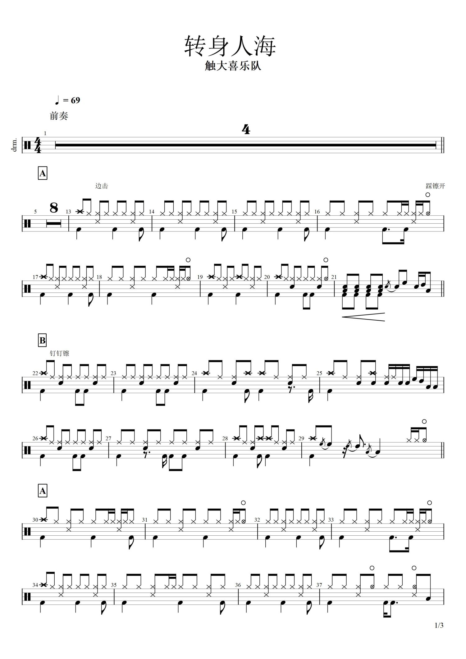 • 转身人海鼓谱 - 触大喜乐队 - 架子鼓谱第1张