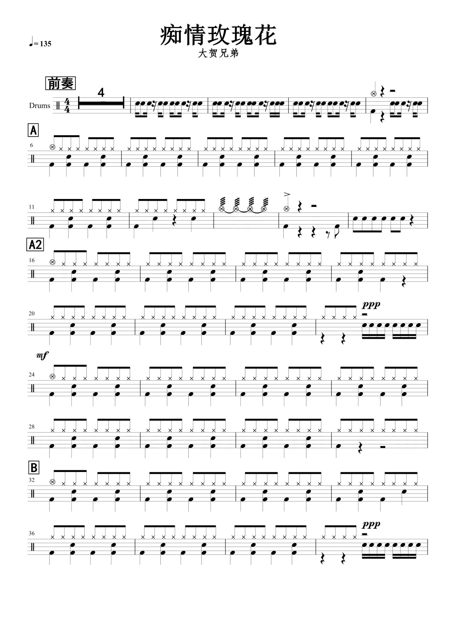 • 痴情玫瑰花鼓谱 - 大贺兄弟 - 架子鼓谱第1张