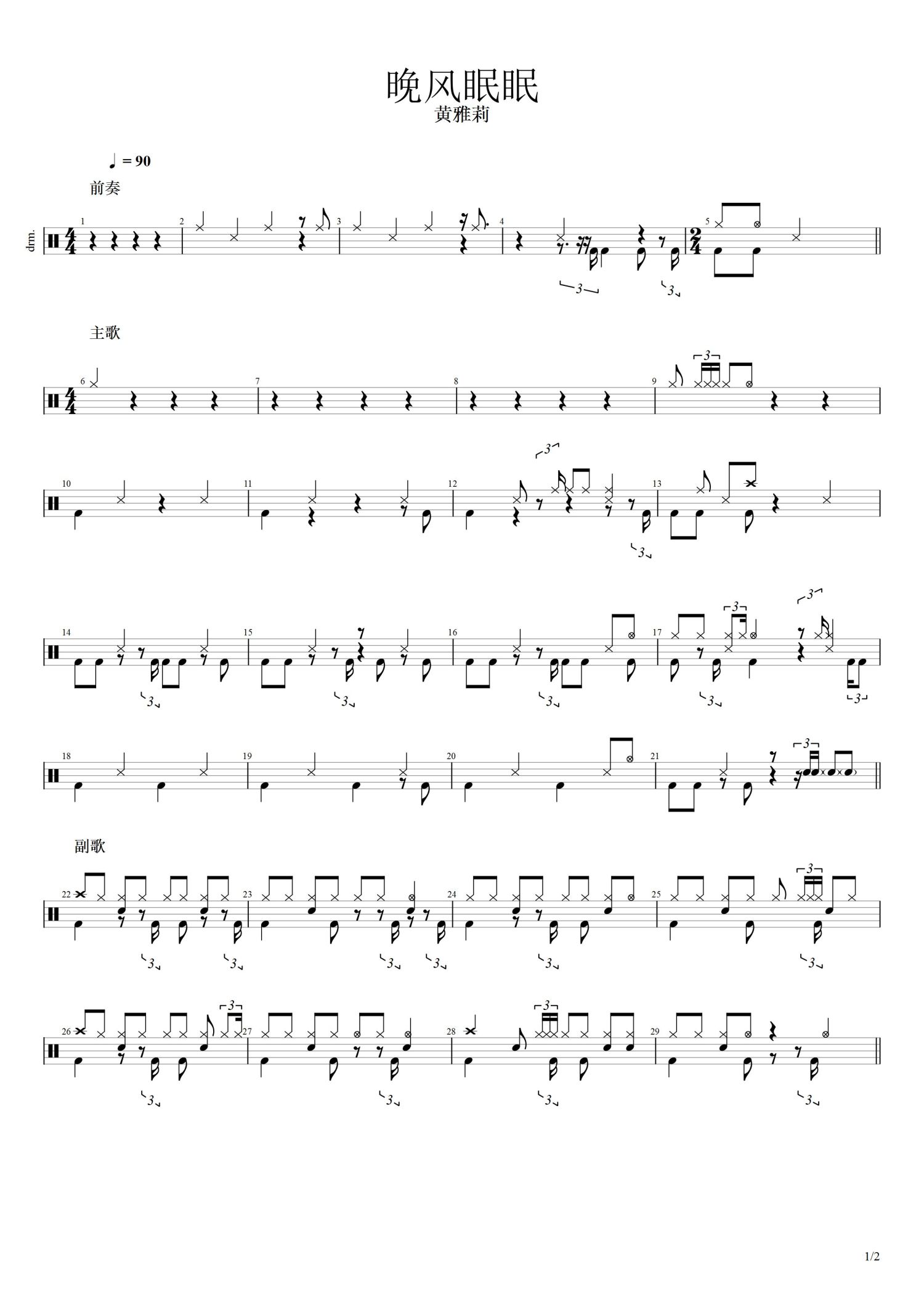 • 晚风眠眠鼓谱 - 黄雅莉 - 架子鼓谱第1张