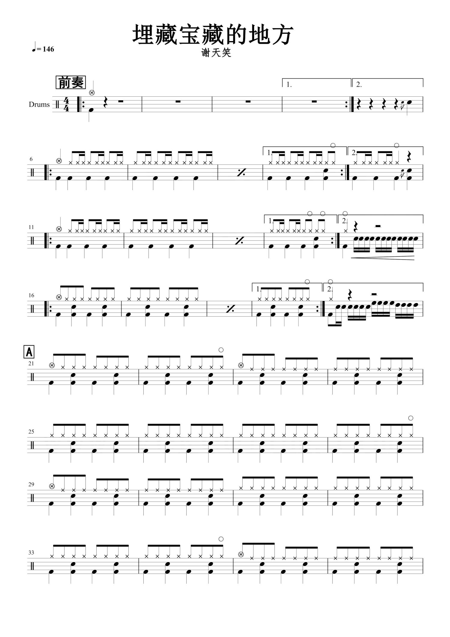 • 埋葬宝藏的地方鼓谱 - 谢天笑 - 架子鼓谱第1张