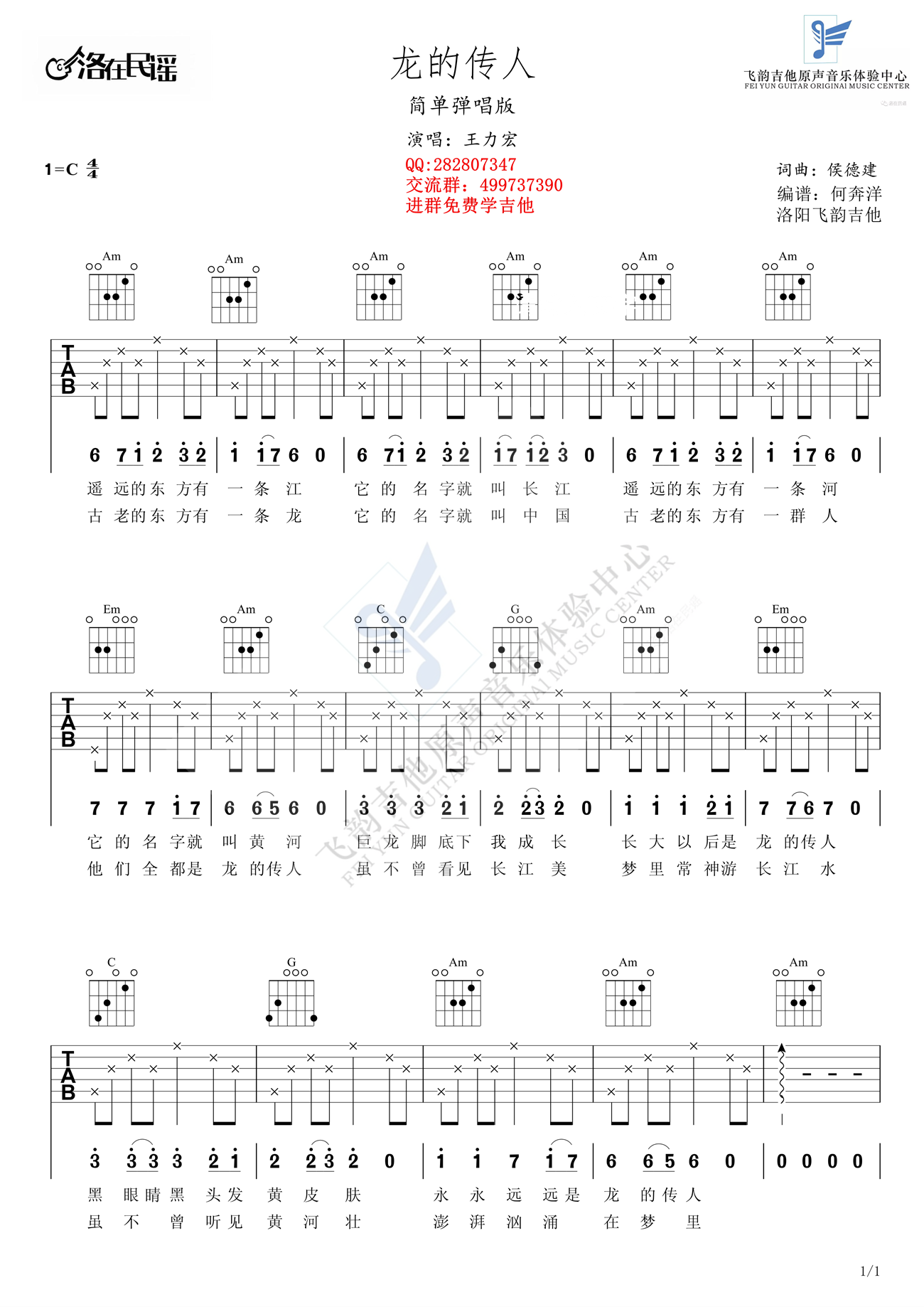 曲谱介绍: 王力宏《龙的传人》吉他谱_C调吉他弹唱谱