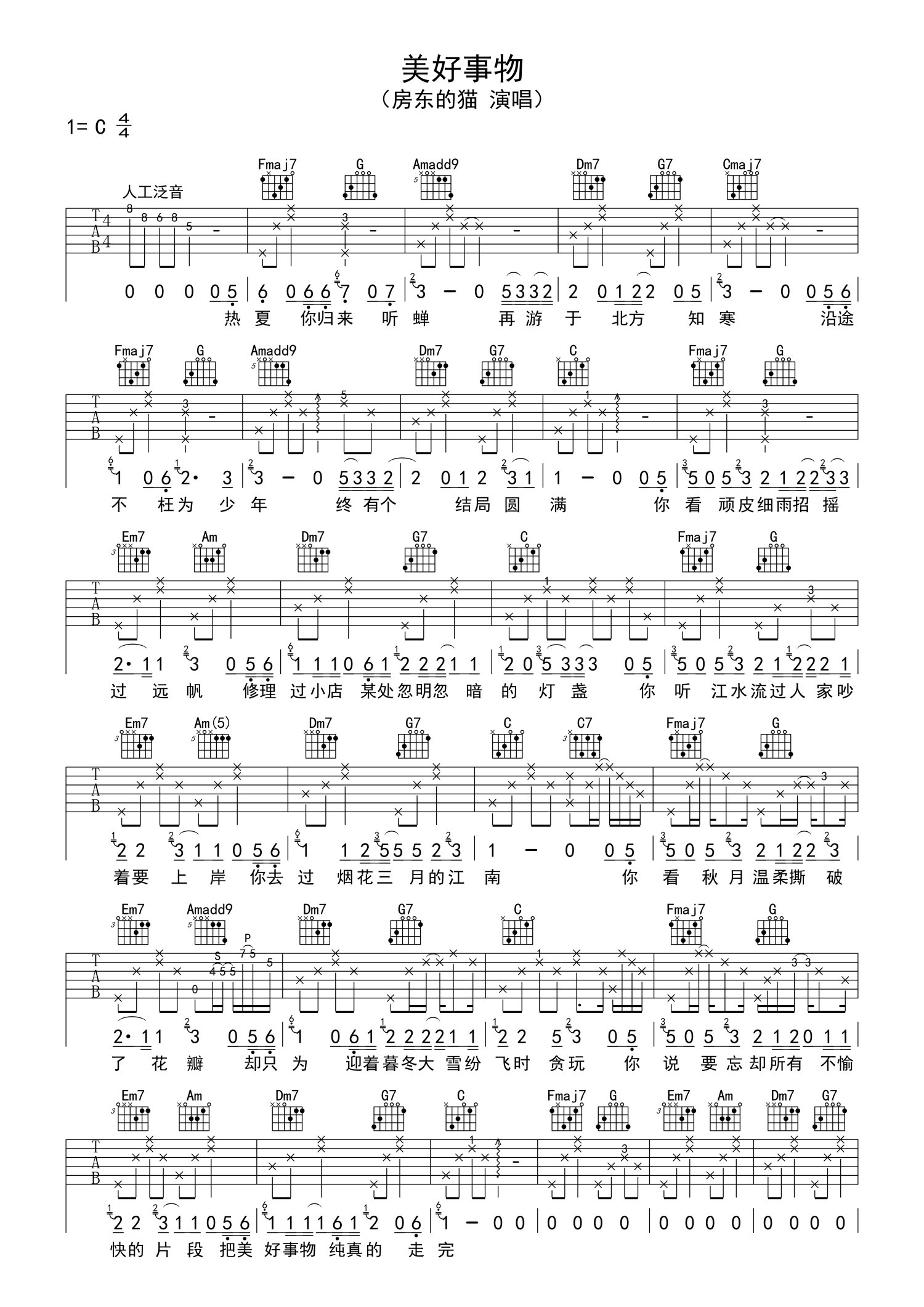 • 美好事物吉他谱 - 房东的猫 - C调吉他弹唱谱第1张