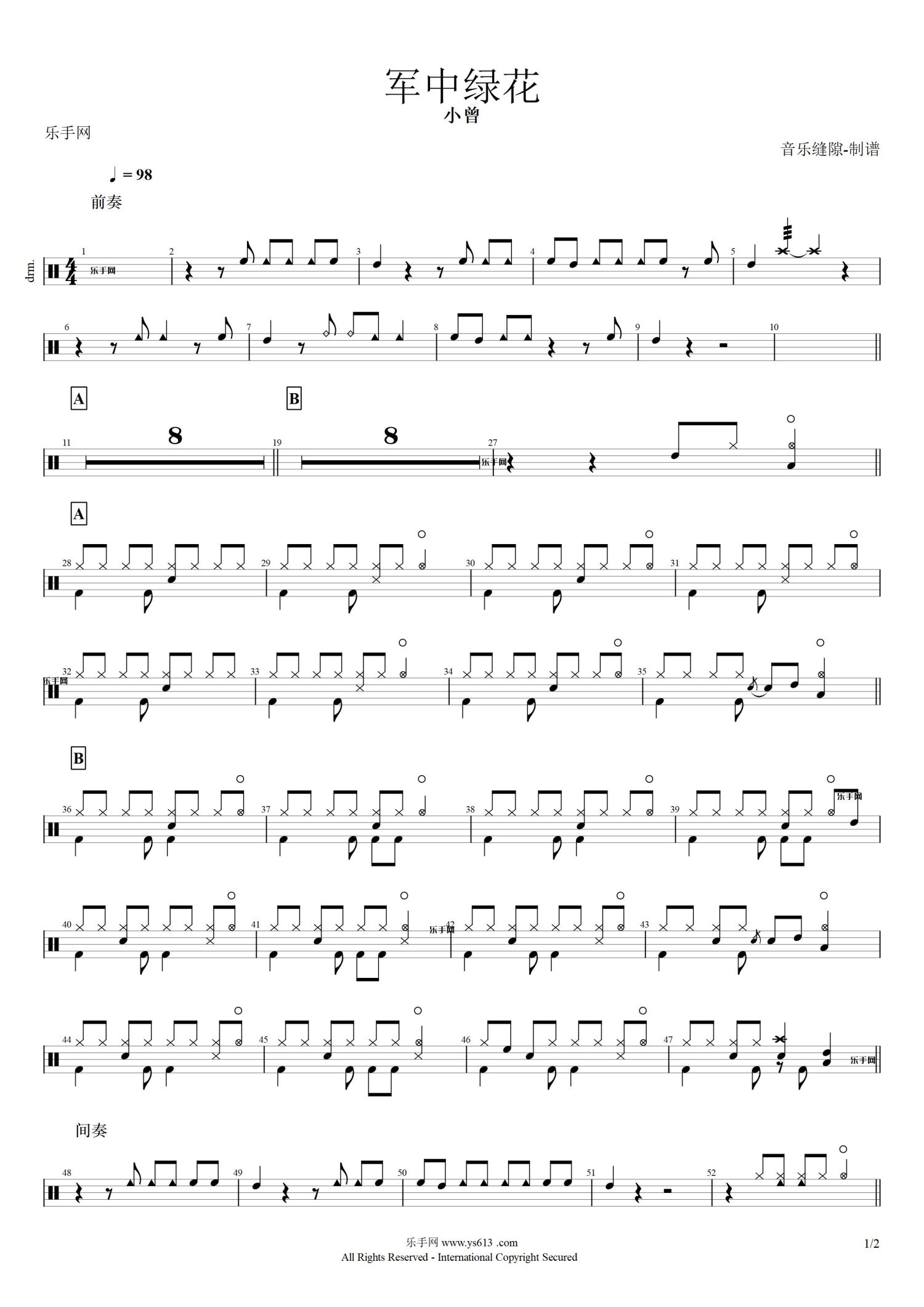 • 军中绿花鼓谱 - 小曾 - 架子鼓谱第1张