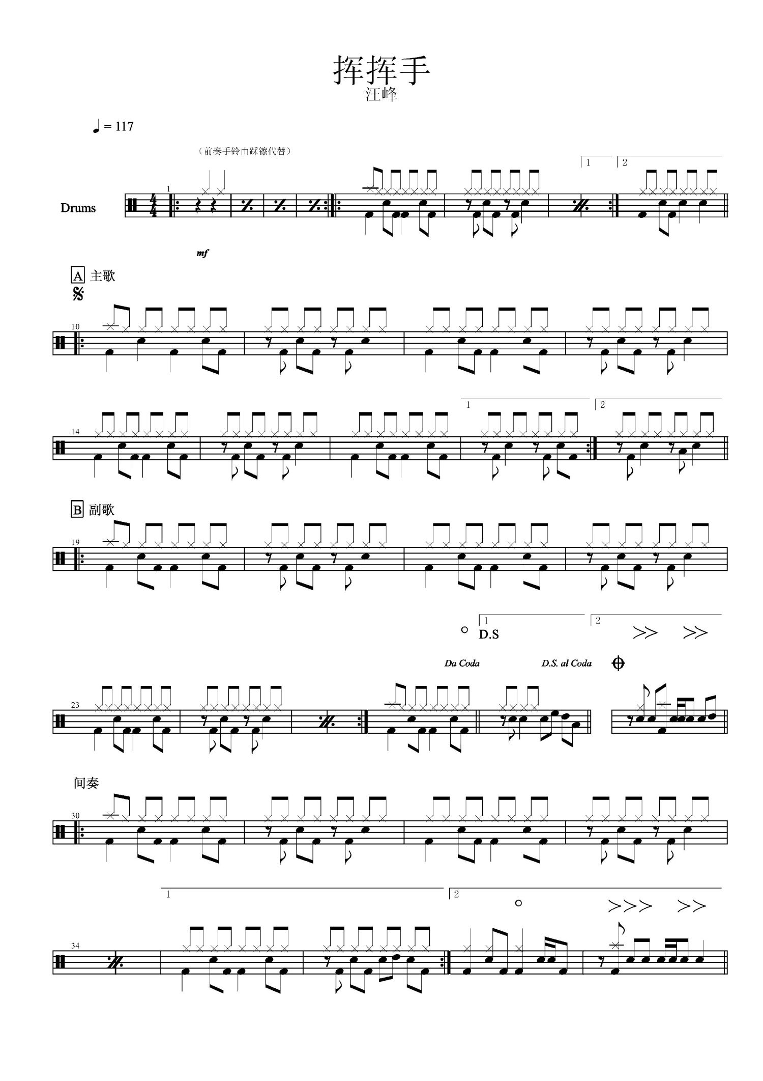 • 挥挥手鼓谱 - 汪峰 - 架子鼓谱第1张