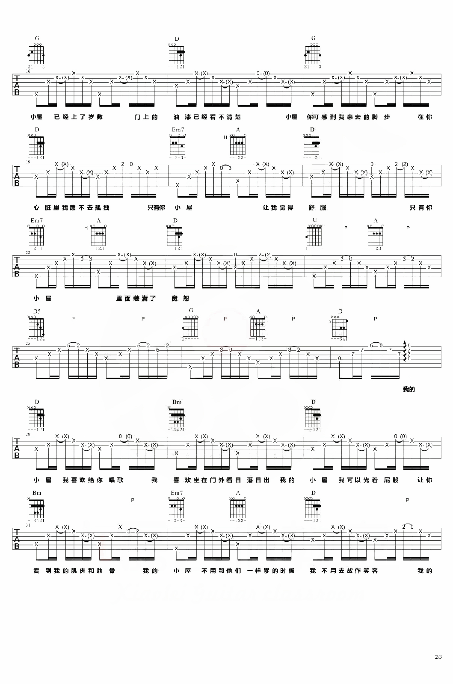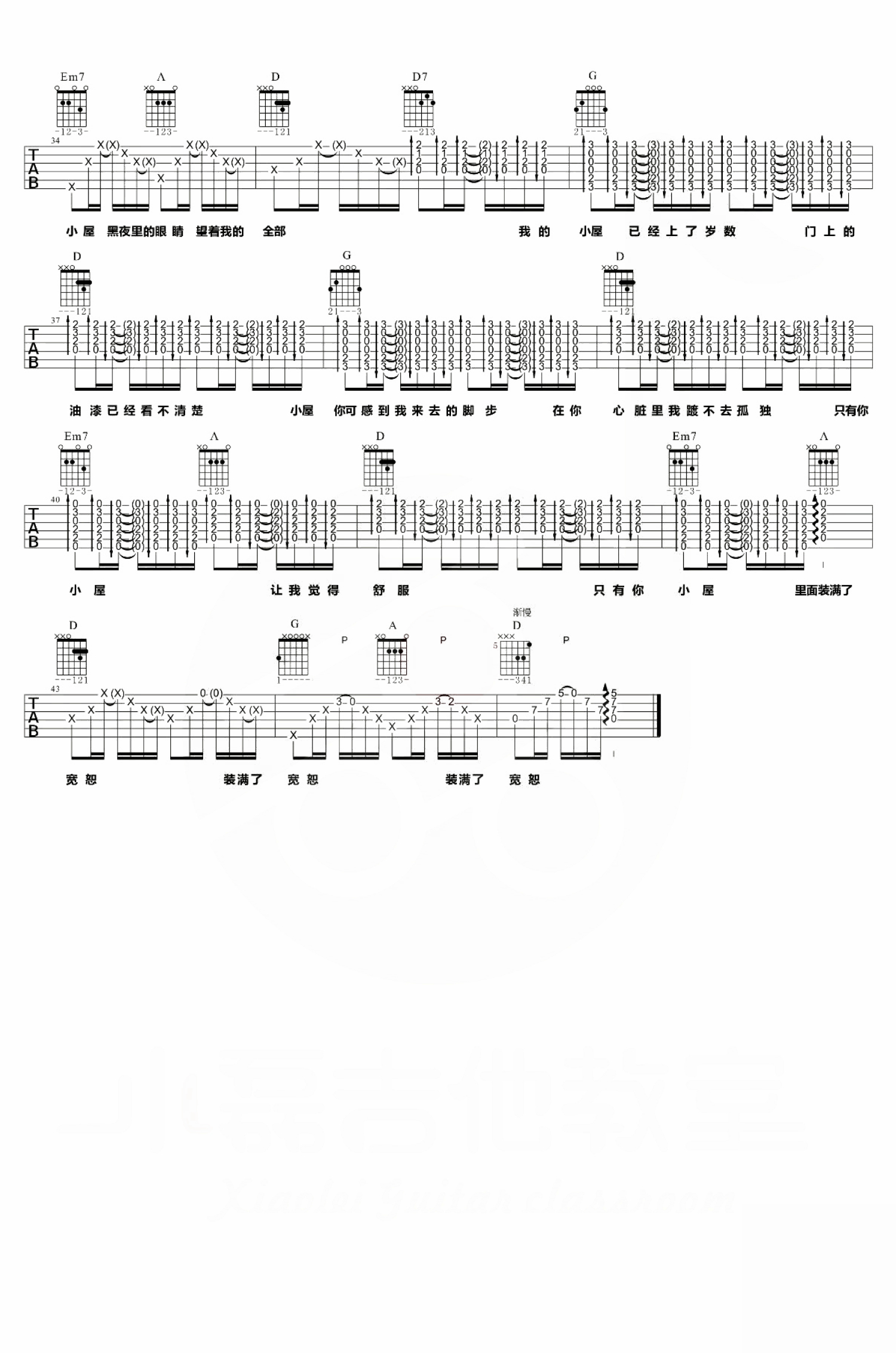 曲谱介绍: 赵雷《小屋》吉他谱,原调E,选调D调指法,变调夹夹二品。赵雷的一首好听的民谣歌曲,曲谱大量用到了16分音符和连线,还有前奏用到的勾弦技巧,让这首歌曲有了很强的练习意义。加上歌曲前后结构分明,最后一部分用到了扫弦,也为歌曲提升了层次,使得更值得琴友们学习。这里随谱附上配套吉他弹唱教学视频,方便大家参照练习。