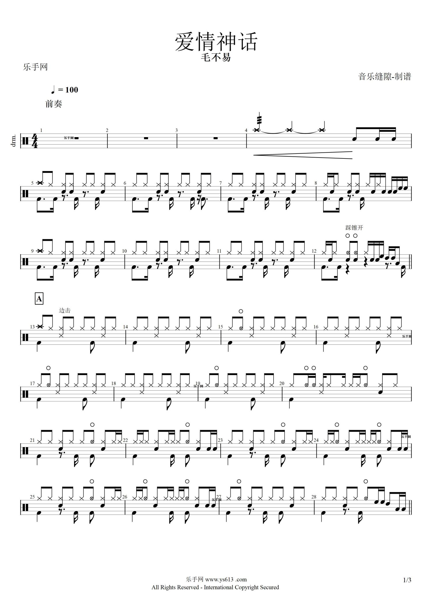 • 爱情神话鼓谱 - 毛不易 - 架子鼓谱第1张