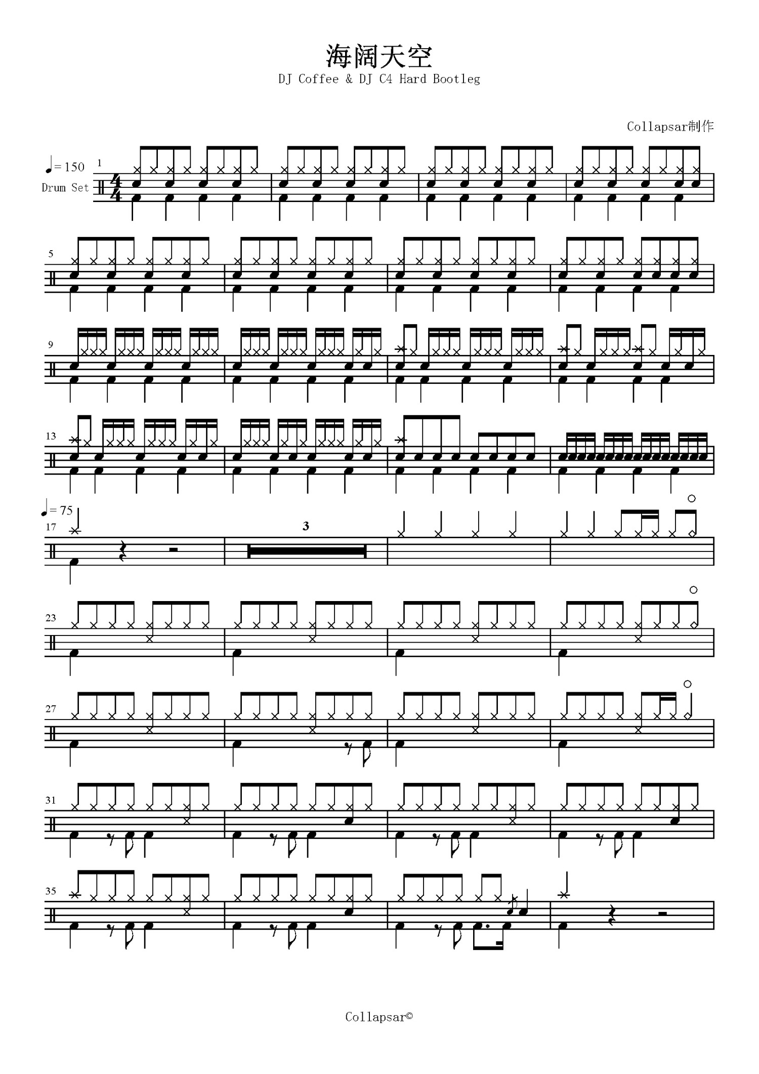 海阔天空鼓谱 - DJ Coffee & DJ C4 Hard Bootleg - 架子鼓谱