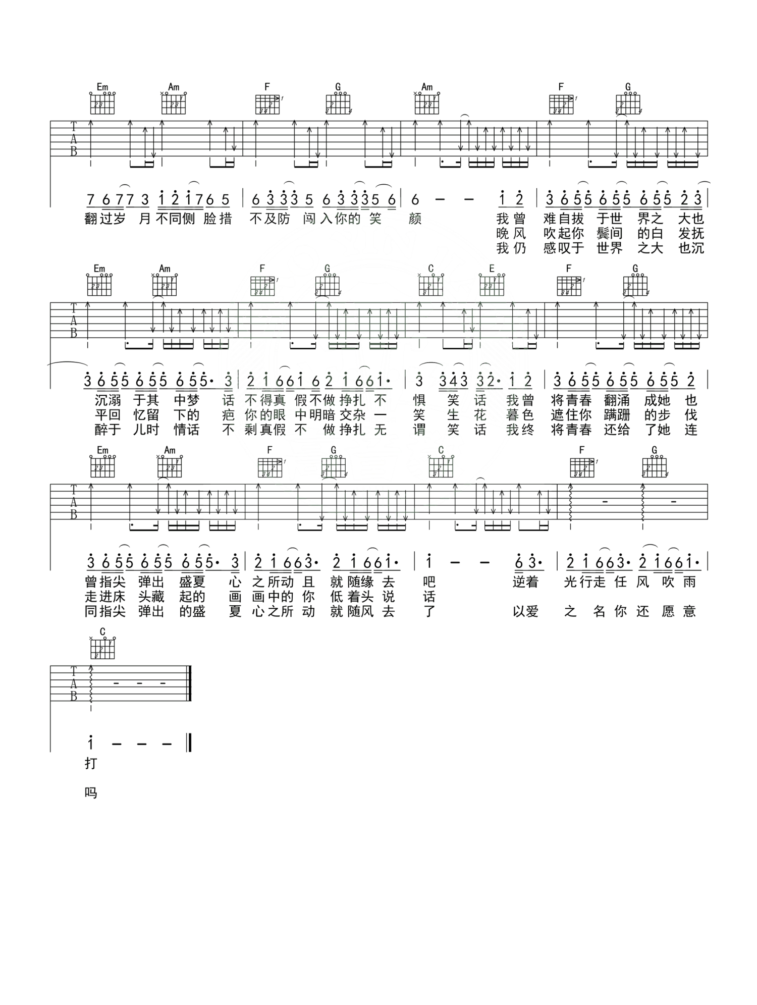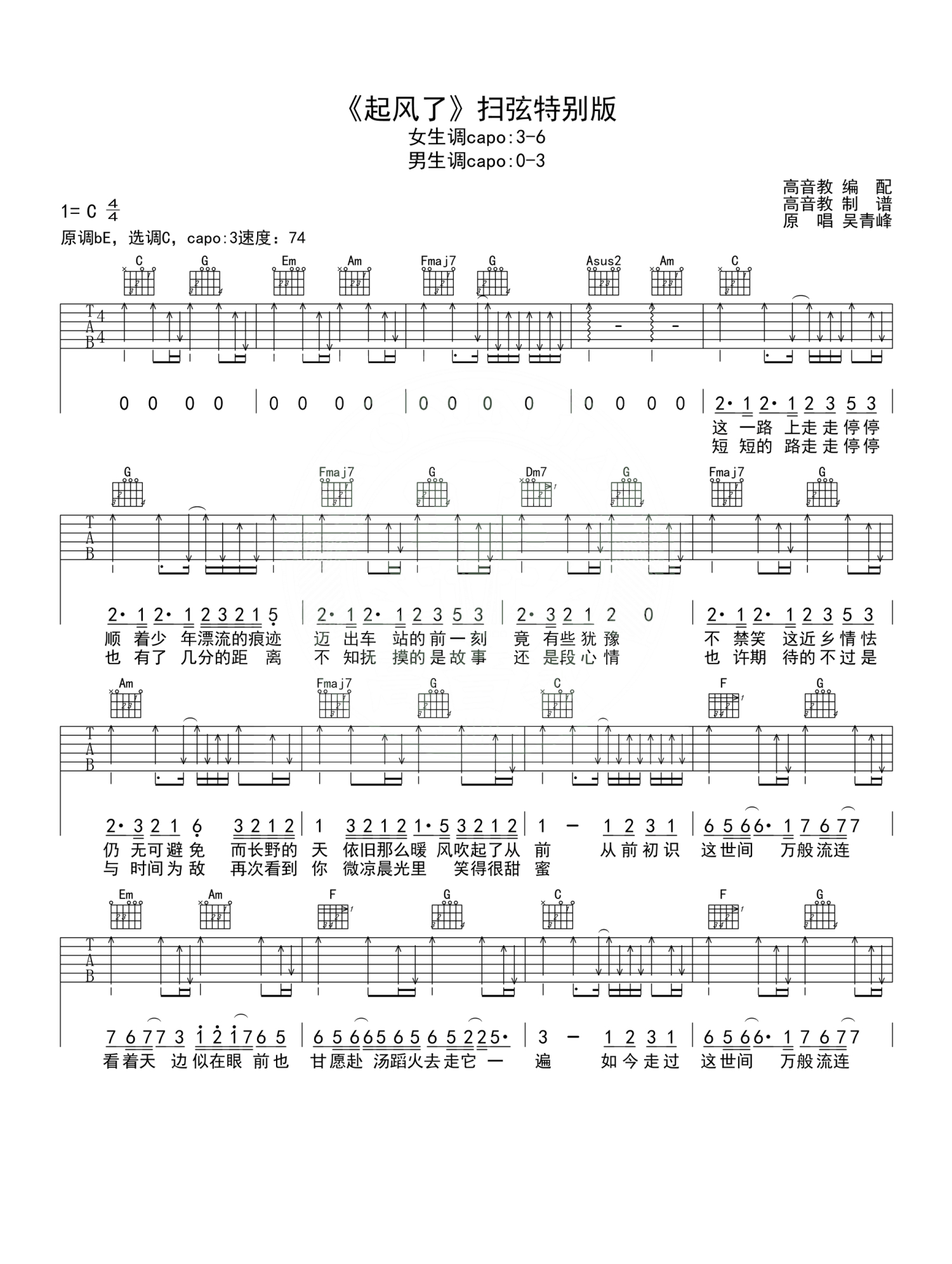 曲谱介绍: 吴青峰《歌手2019》最具特色的演绎版本,起风了吉他六线谱,C调扫弦版编配,变调夹推荐,女生3-6品,男生0-3品。年少时意气风发,一路闯荡天涯,受过伤、流过泪、慢慢的成长,磨练也好,得到也罢,伴随着失去和不舍,一次又一次的泪水中渐渐长大。而回首之时却仍是那个少年,身后还是那花那景。