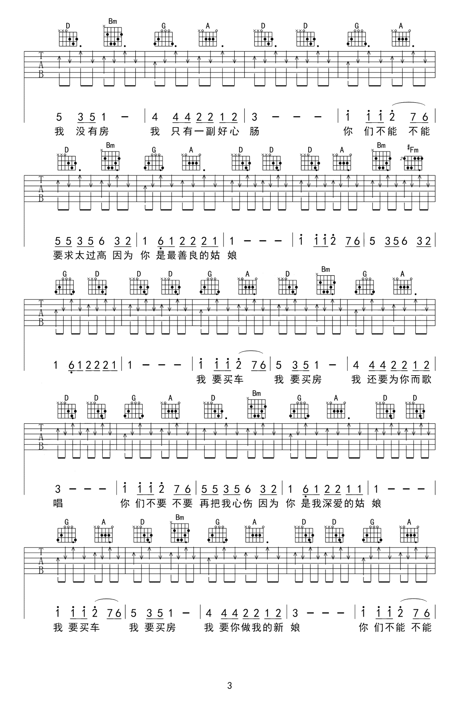 曲谱介绍: 没有车没有房吉他谱,孙辉演唱的一首励志网络歌曲,D调弹唱谱。轻快的节奏,朗朗上口的旋律,没有怨天尤人,深入生活的俏皮歌词,唱出无数男同胞内心的呐喊,让平淡的生活显得那么充满情趣和阳光。