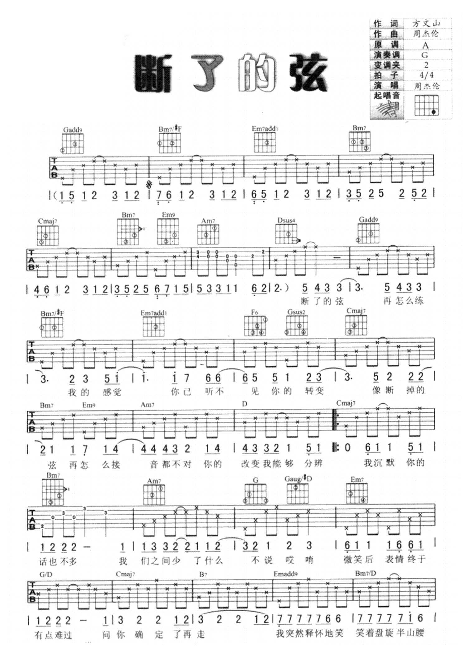曲谱介绍: 周杰伦《断了的弦》吉他谱_G调吉他弹唱谱