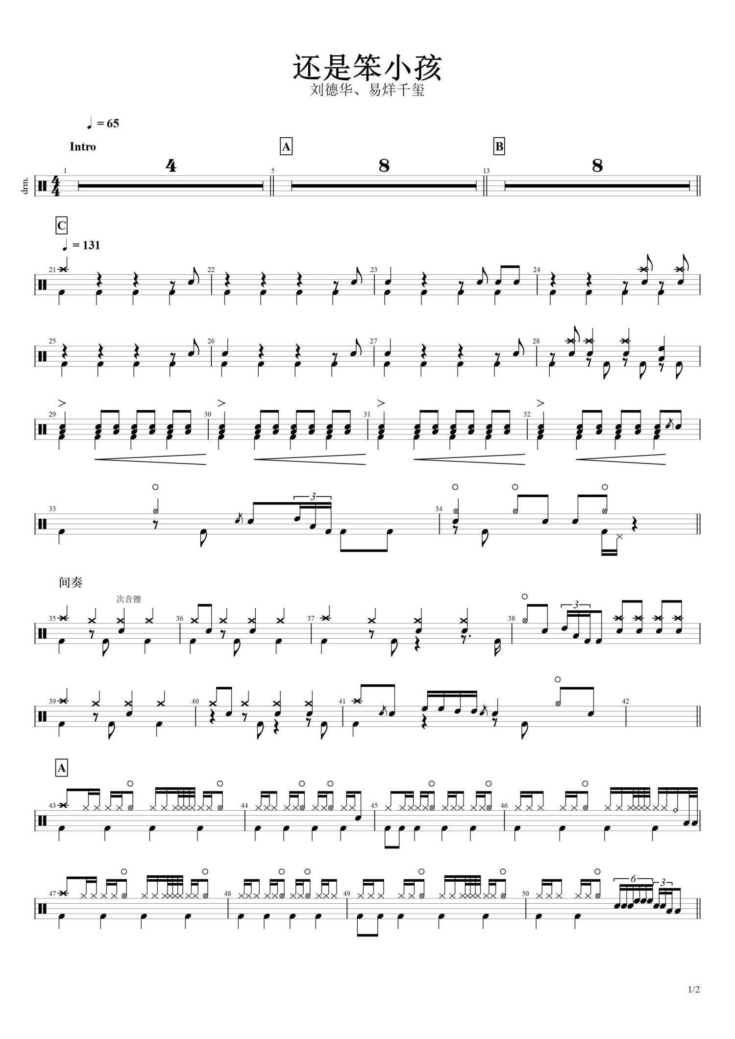 • 还是笨小孩鼓谱 - 刘德华/易烊千玺 - 架子鼓谱第1张