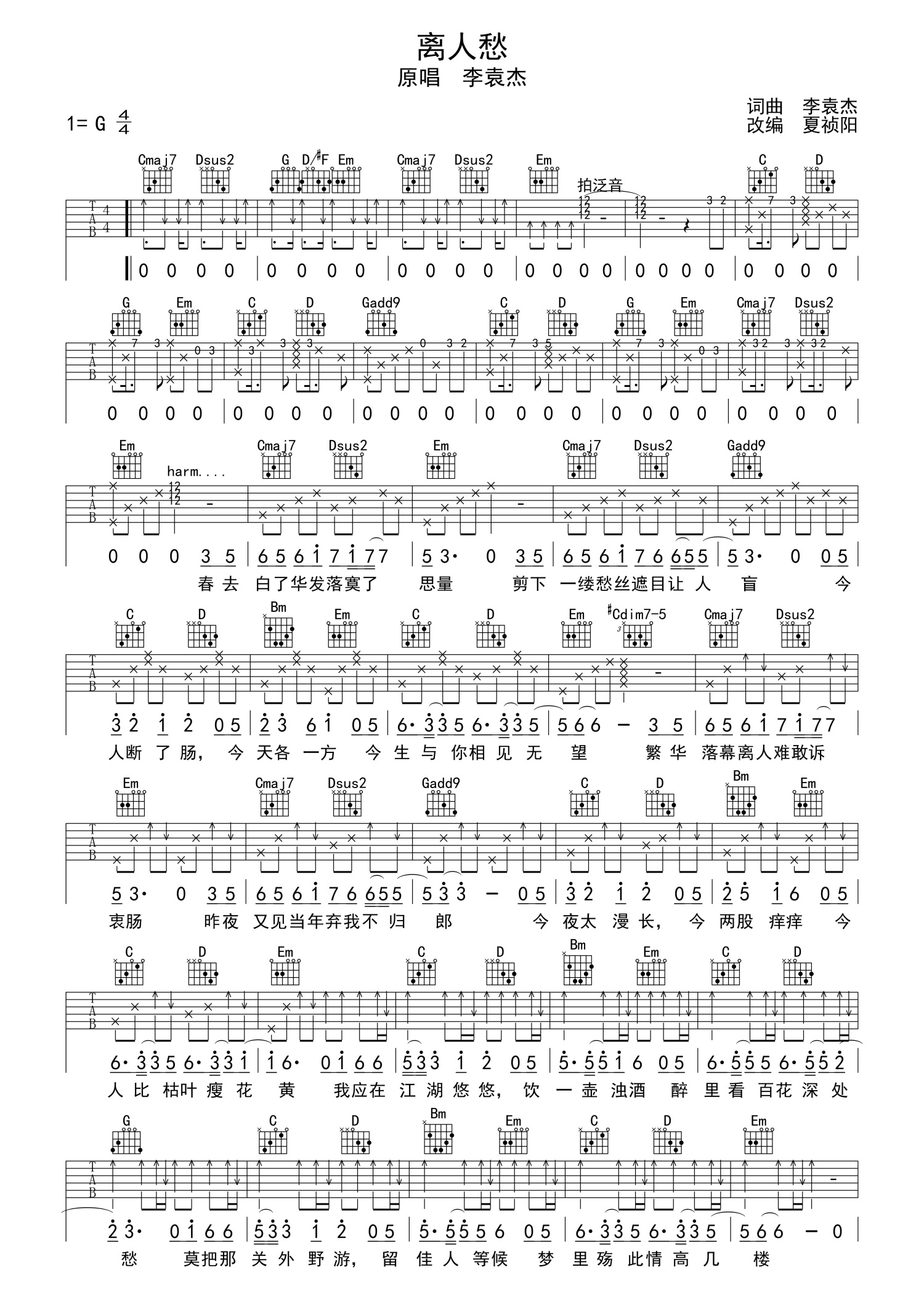 • 离人愁吉他谱 - 李袁杰 - G调吉他弹唱谱第1张