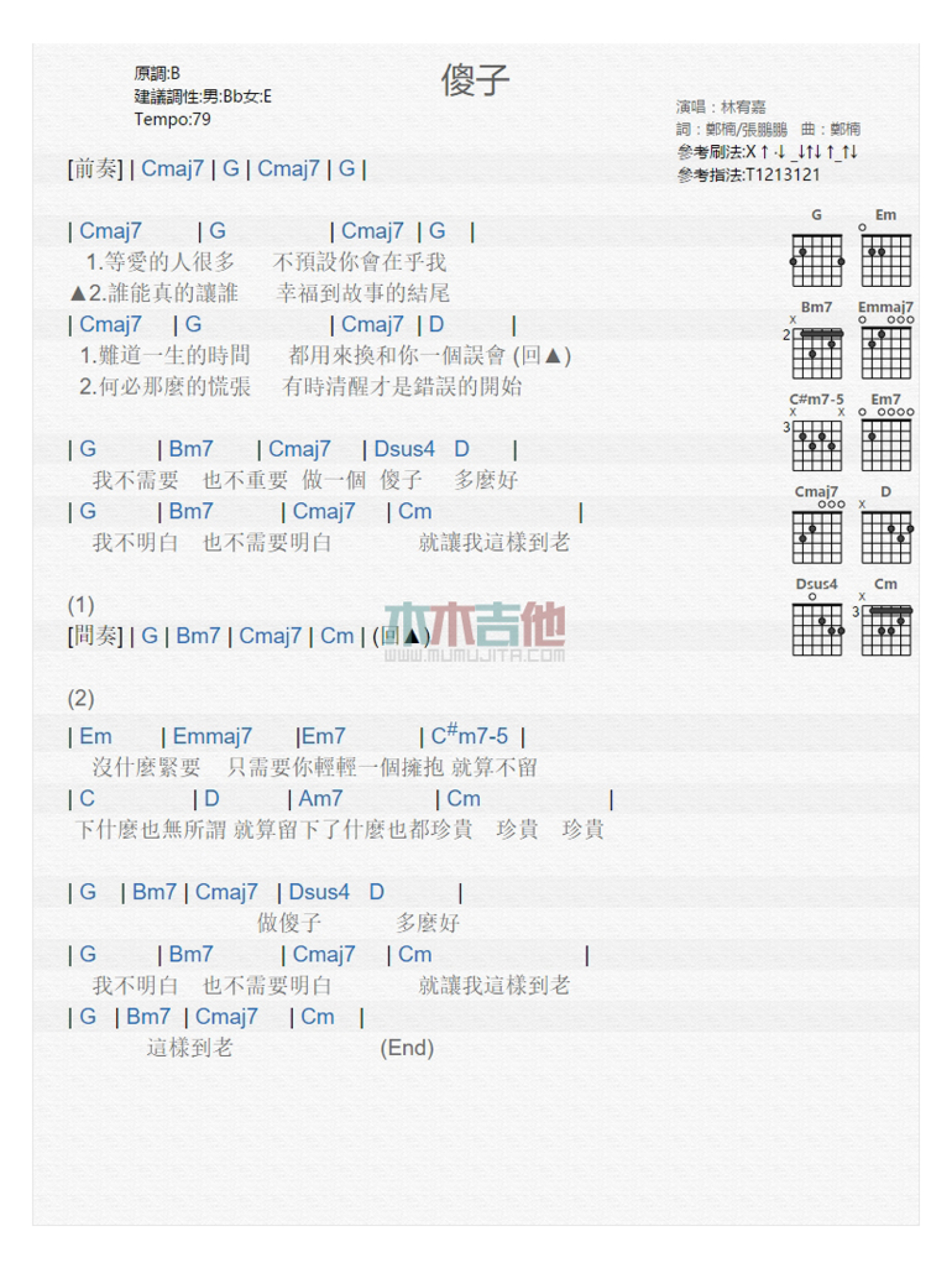 傻子吉他谱 - 林宥嘉 - 吉他弹唱谱 - 和弦谱