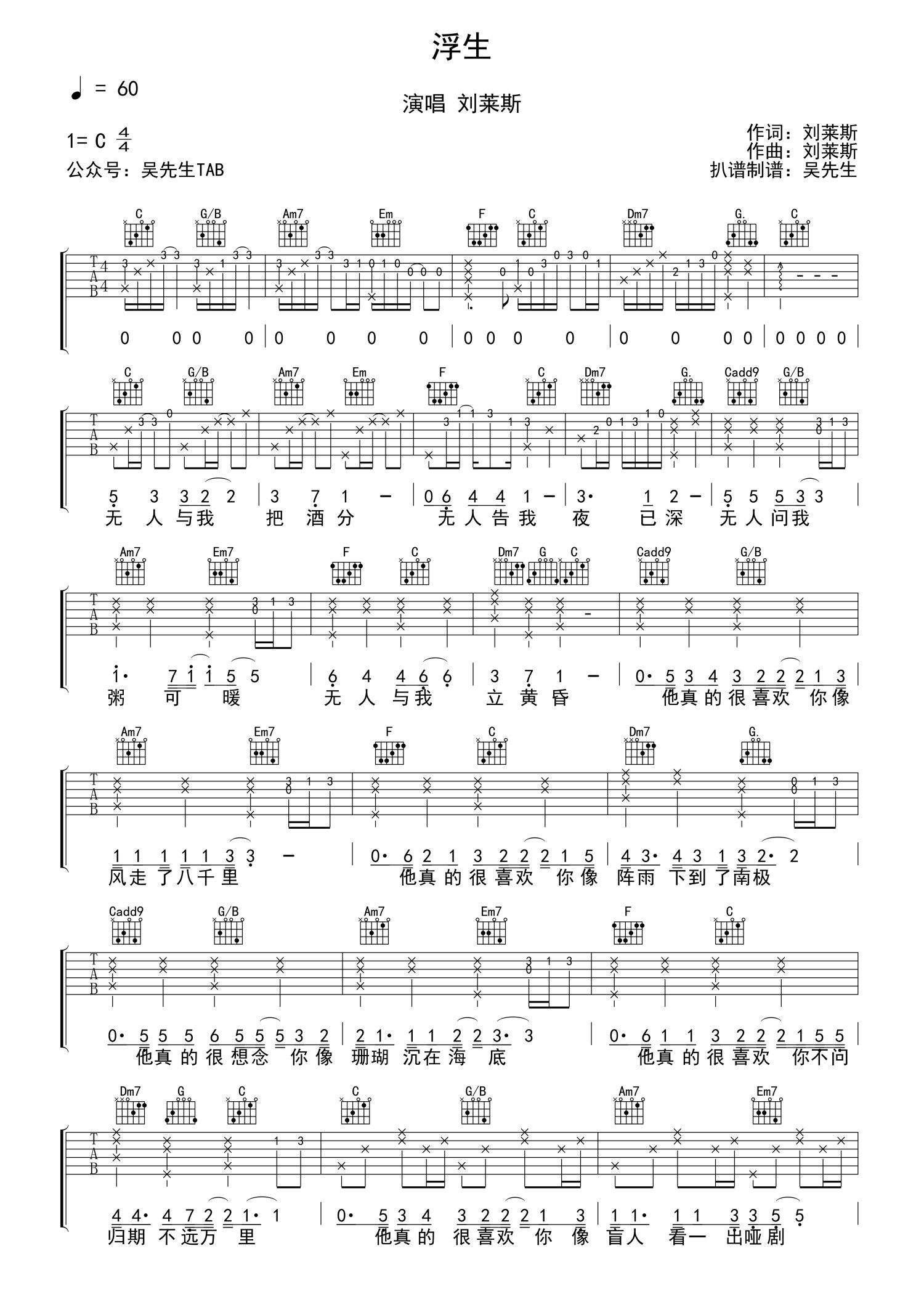 • 浮生吉他谱 - 刘莱斯 - C调吉他弹唱谱第1张