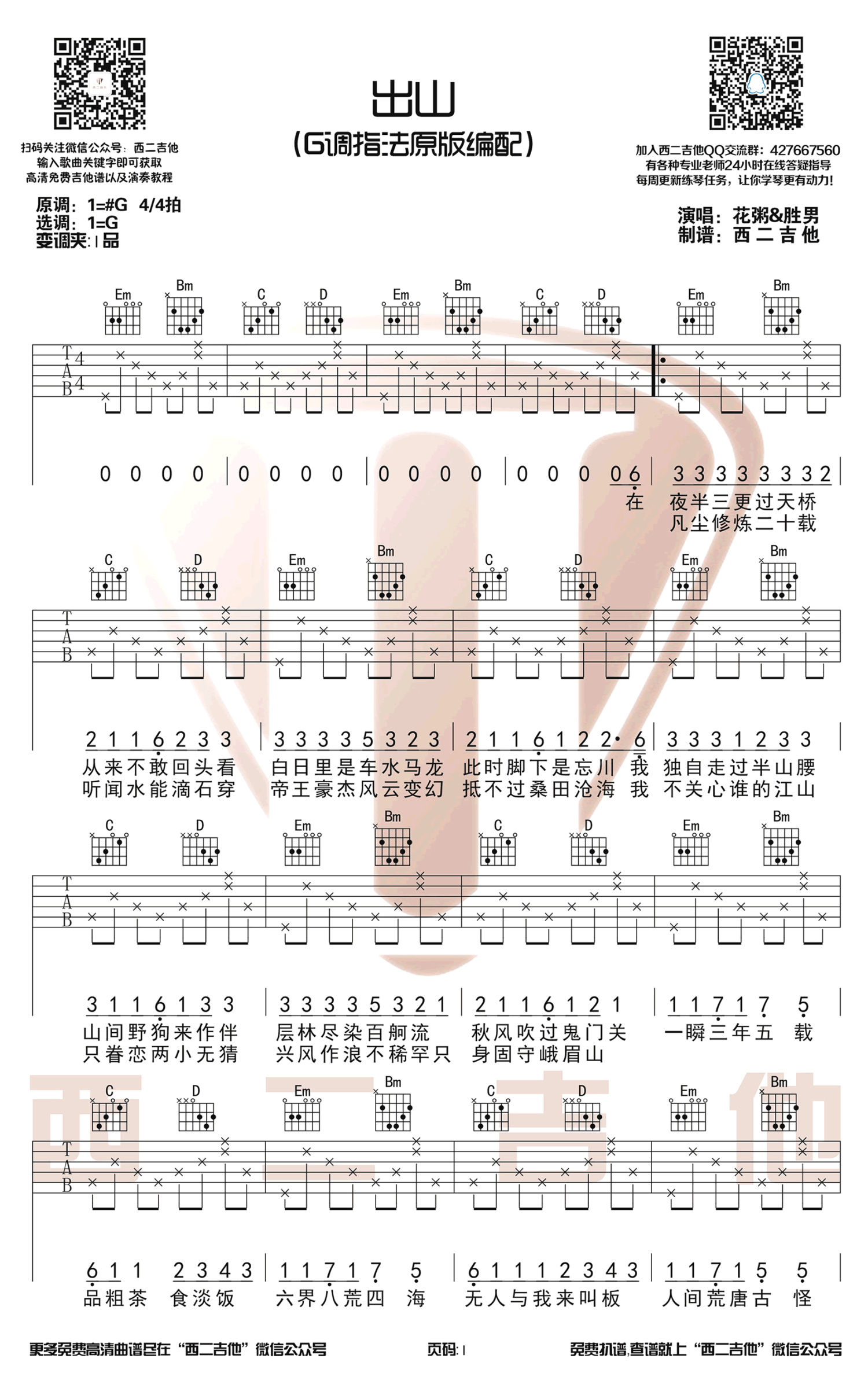 出山吉他谱 - 花粥/王胜男 - G调吉他弹唱谱