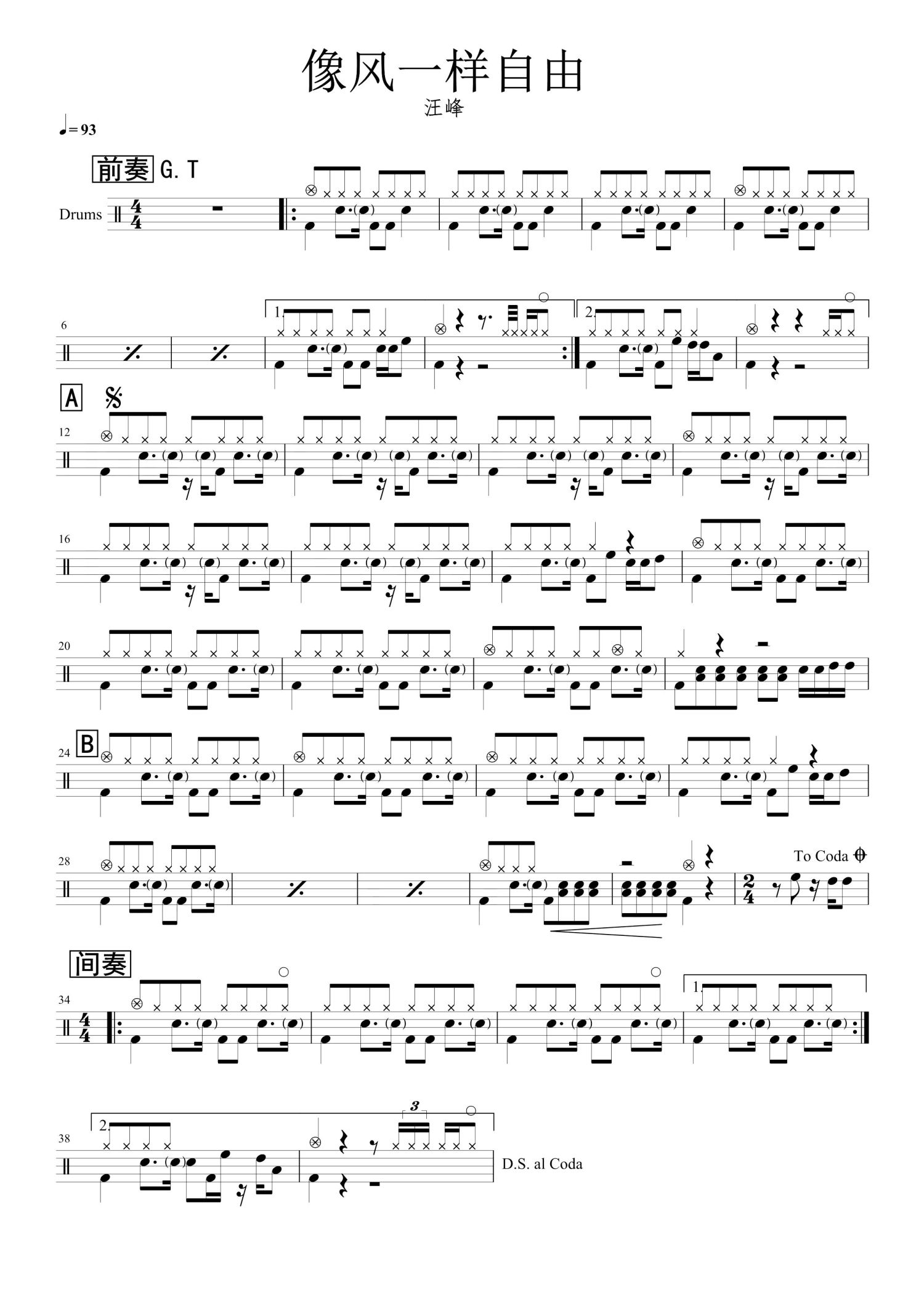 • 像风一样自由鼓谱 - 许巍 - 架子鼓谱第1张