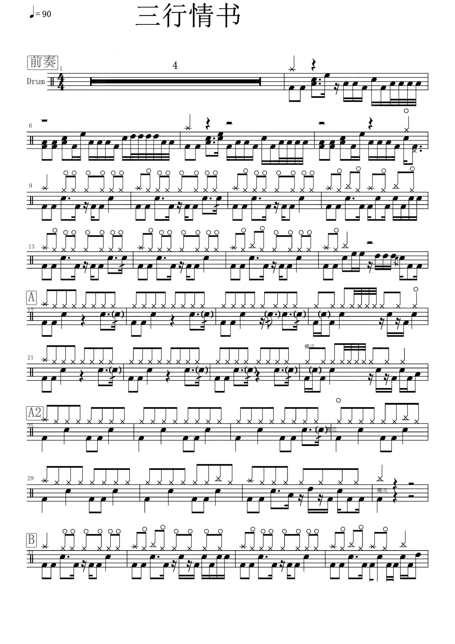 三行情书鼓谱 - 曹旭/潘雪娇/戚唯 - 架子鼓谱
