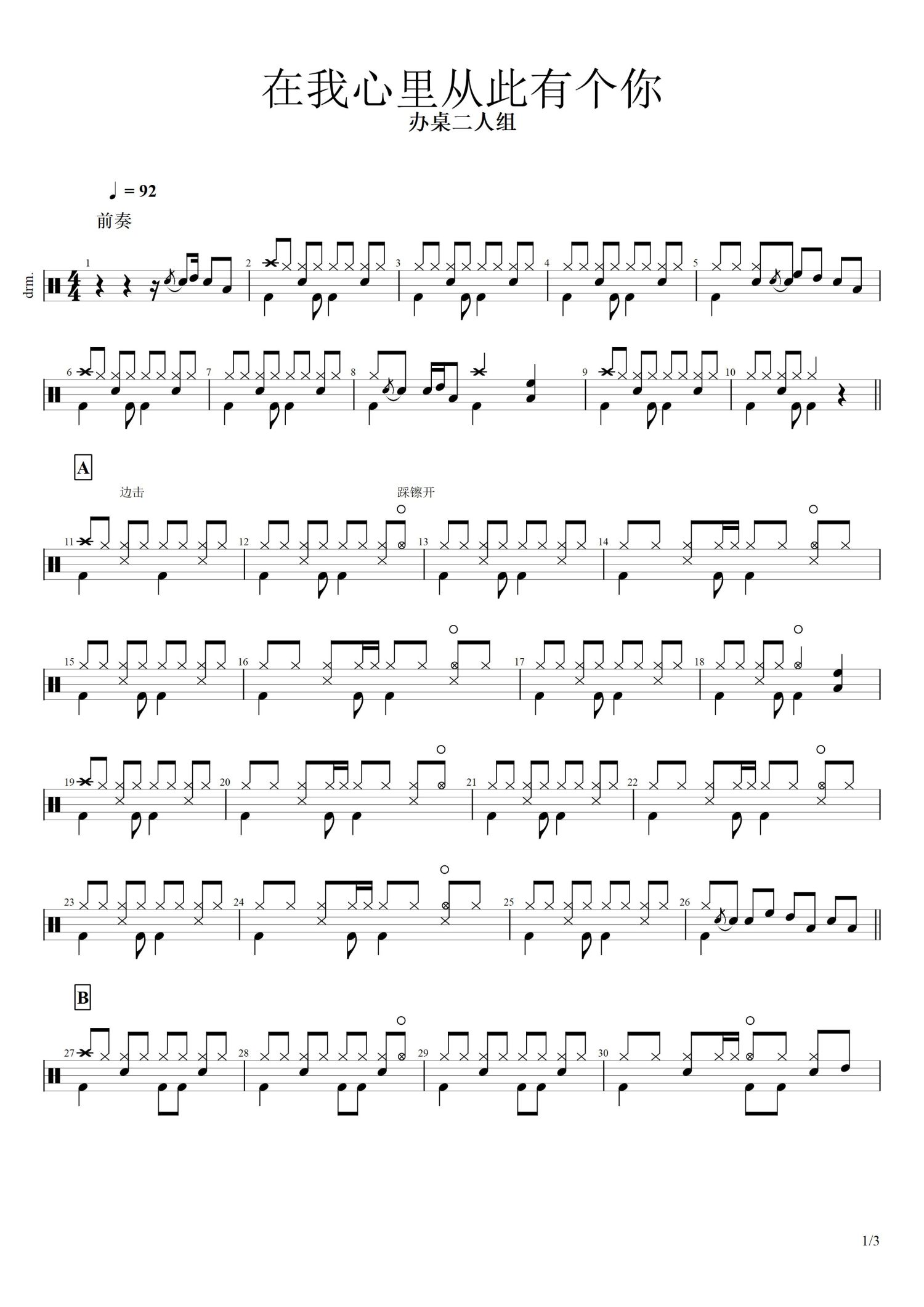 • 在心里从此永远有个你鼓谱 - 办桌二人组 - 架子鼓谱第1张