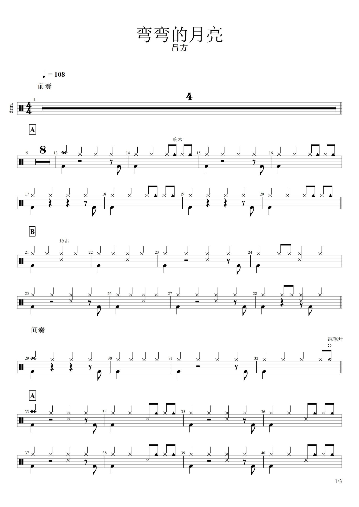 • 弯弯的月亮鼓谱 - 吕方 - 架子鼓谱第1张