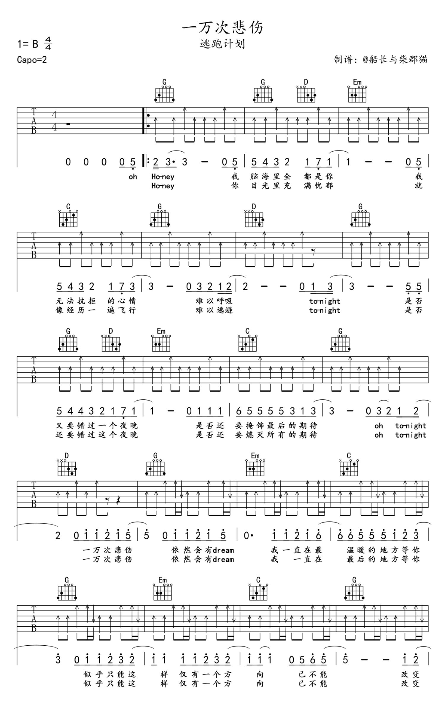 一万次悲伤吉他谱 - 逃跑计划 - G调吉他弹唱谱