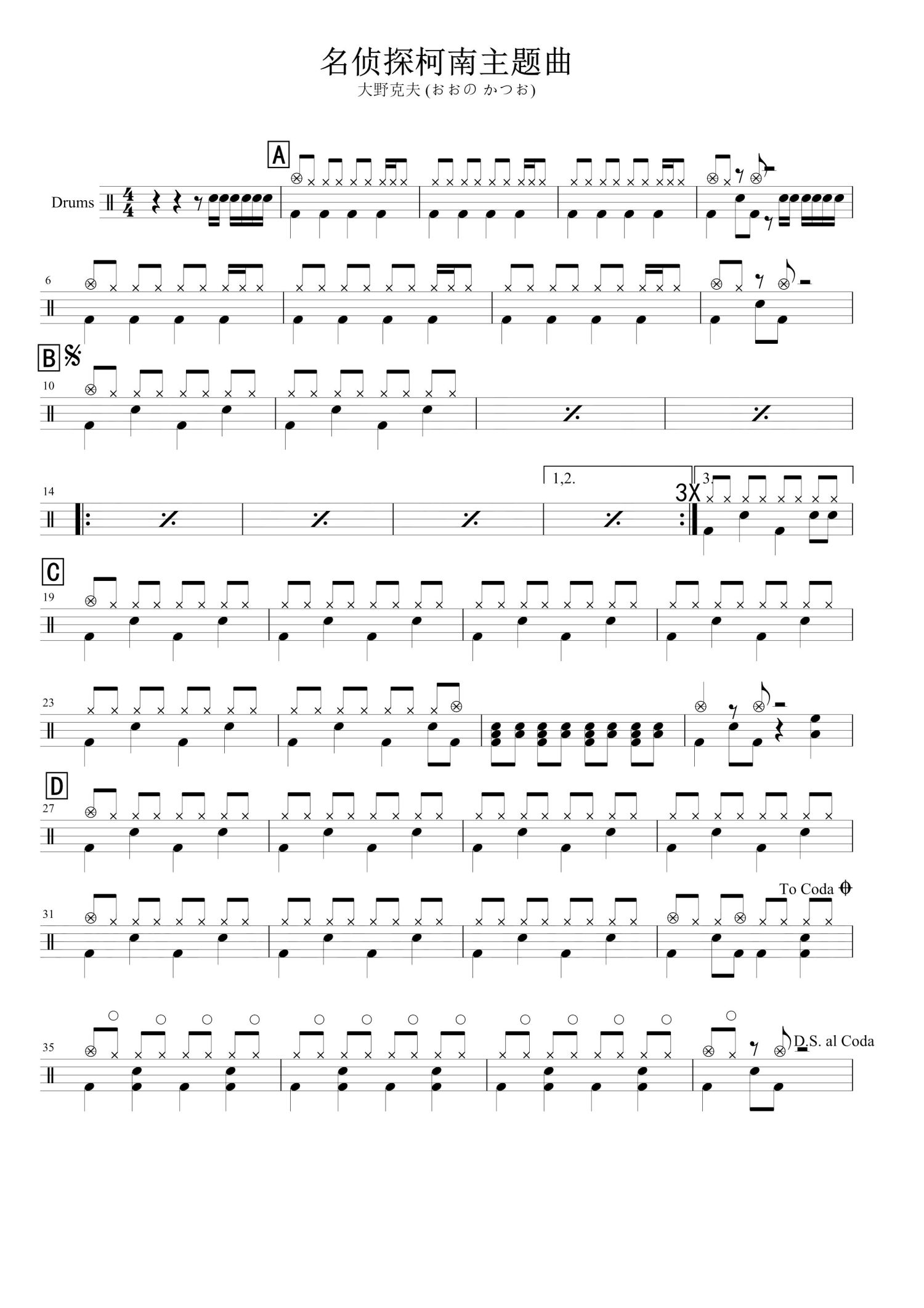 名侦探柯南主题曲鼓谱 - 大野克夫 (おおの かつお) - 架子鼓谱