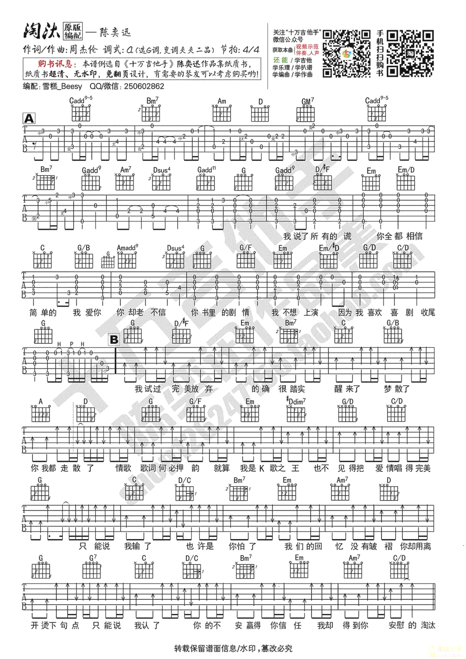 曲谱介绍: 陈奕迅《淘汰》吉他谱,选用G调指法,变调夹夹二品,周杰伦为陈奕迅创作的一首经典情歌,我们的回忆没有皱褶,你却用离开烫下句点。编配说明:这首歌曲编配一般,因为原曲都是一堆钢琴和弦,移植到吉他上无法全部还原,Solo可以练练,因为solo很简单!