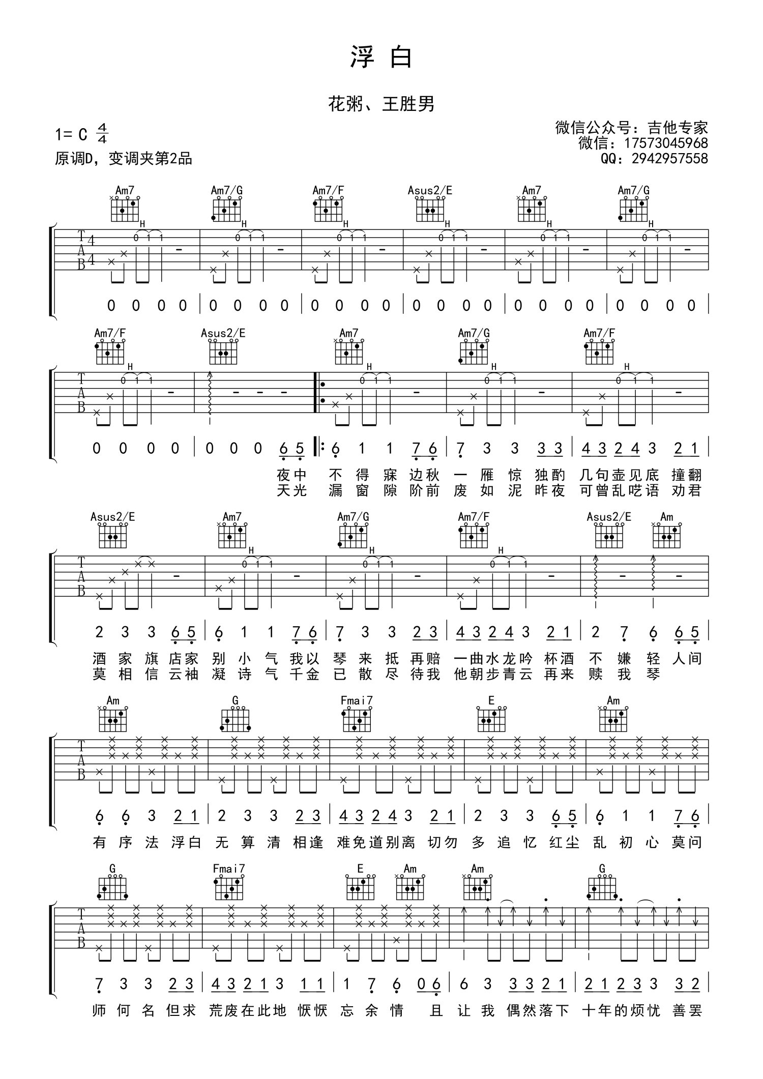 • 浮白吉他谱 - 花粥/王胜男 - C调吉他弹唱谱第1张
