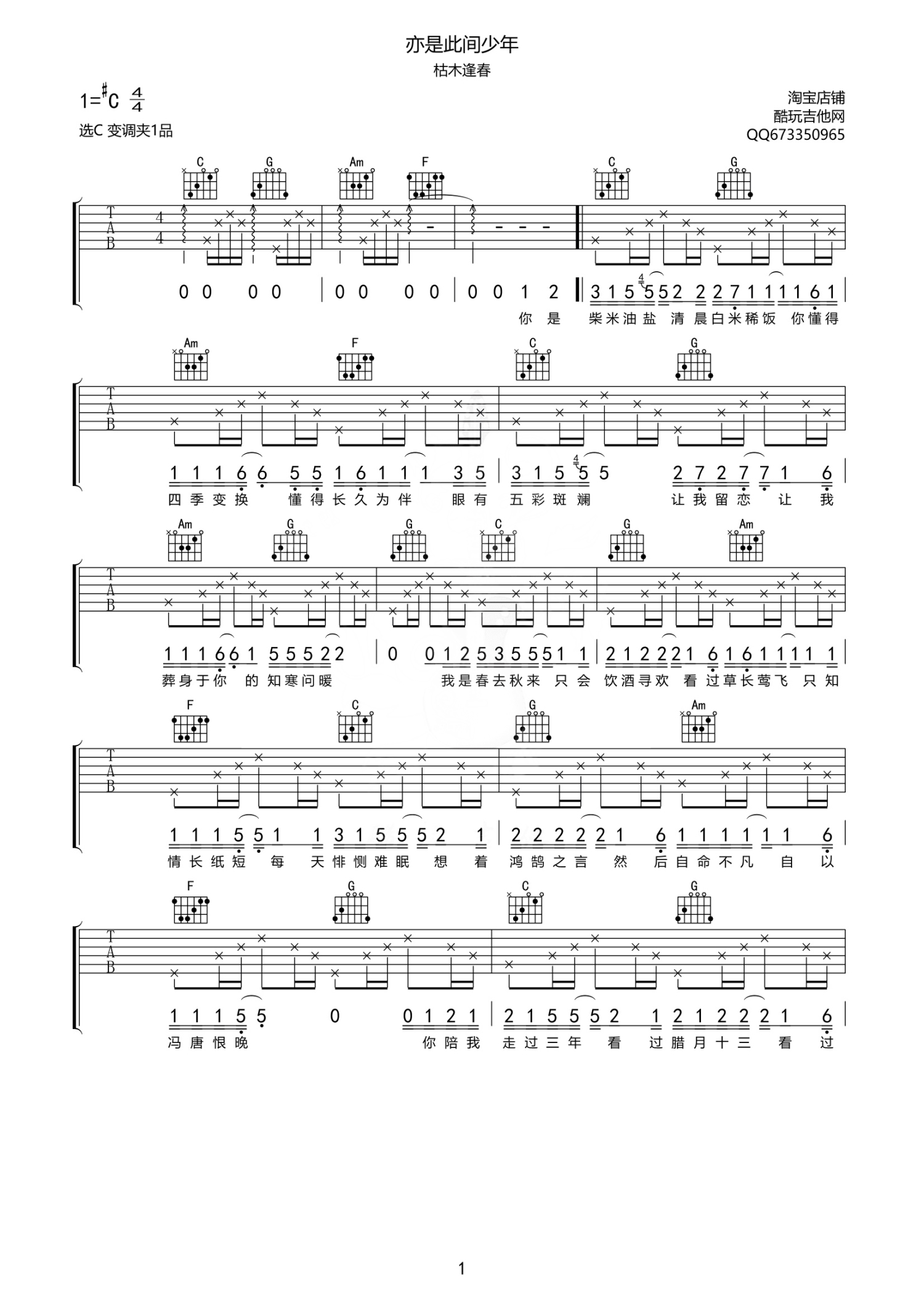 亦是此间少年吉他谱 - 枯木逢春 - C调吉他弹唱谱