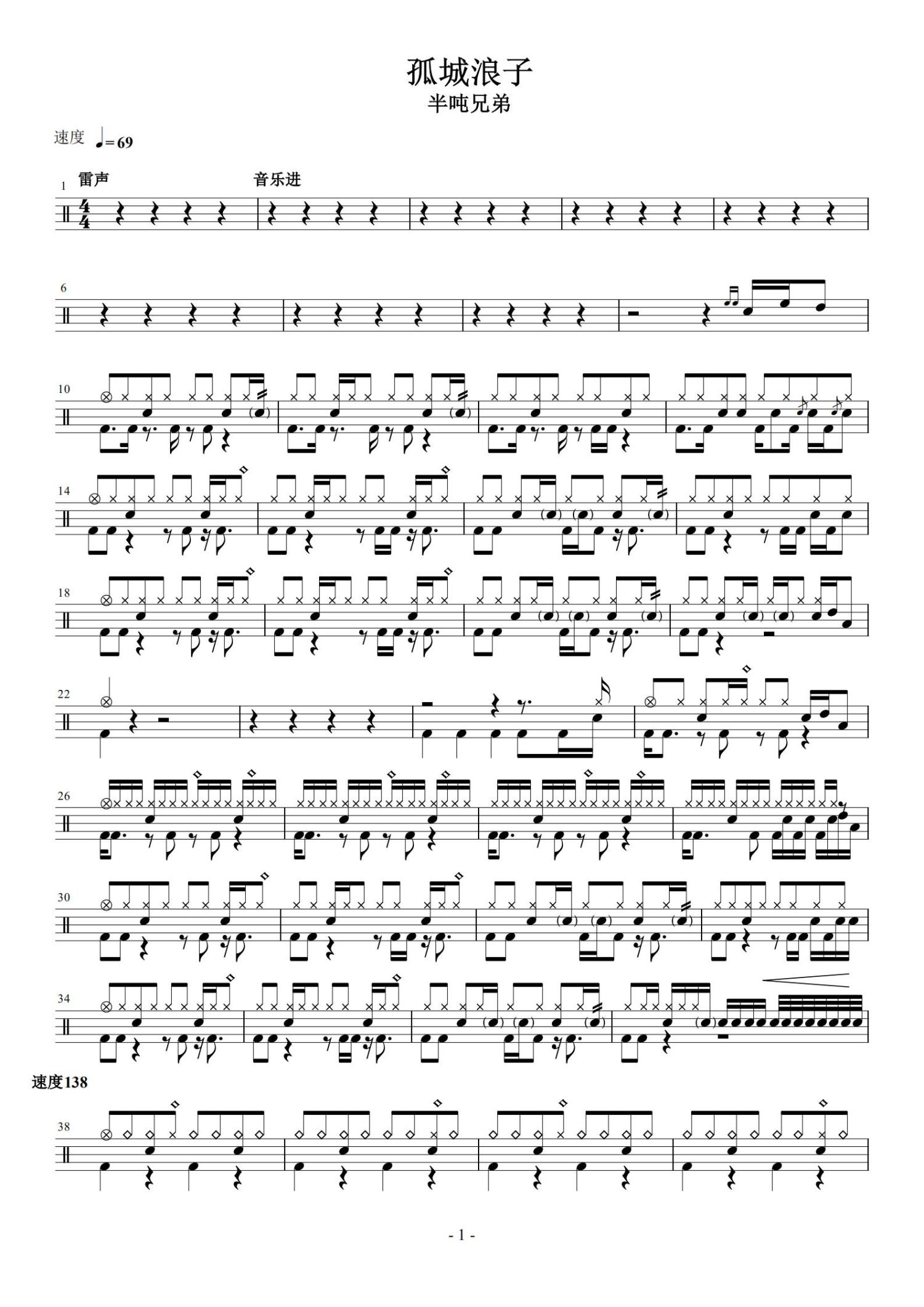 • 孤城浪子鼓谱 - 半吨兄弟 - 架子鼓谱第1张