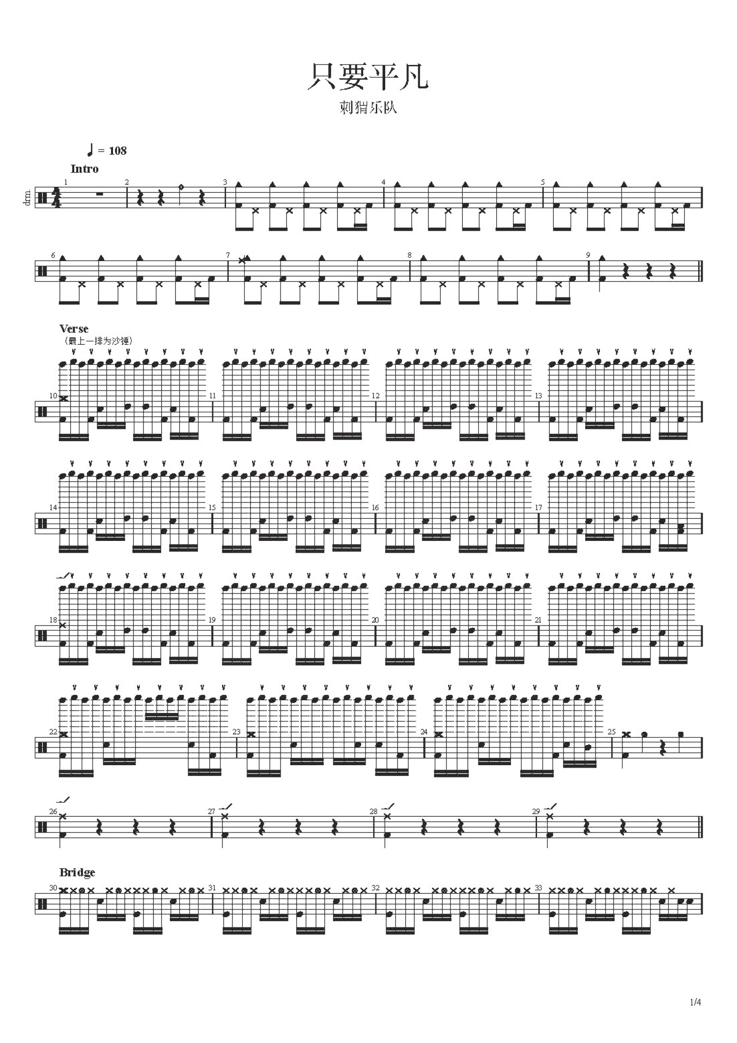 • 只要平凡鼓谱 - 刺猬乐队 - 架子鼓谱第1张