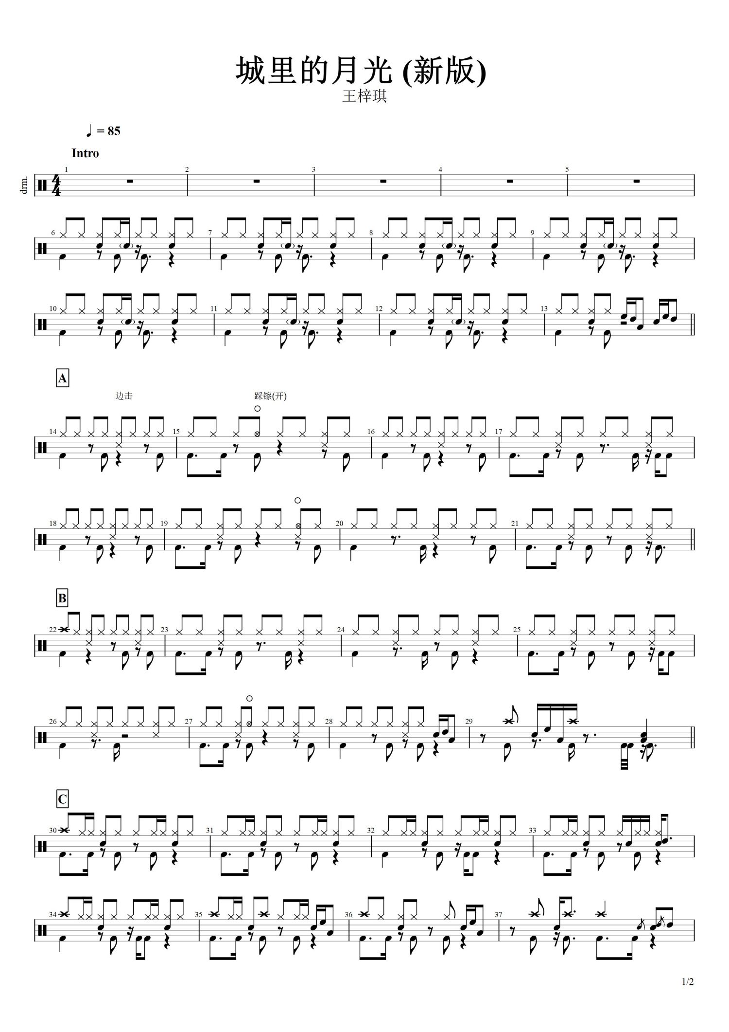 • 城里的月光鼓谱 - 王梓琪 - 架子鼓谱 - 新版第1张