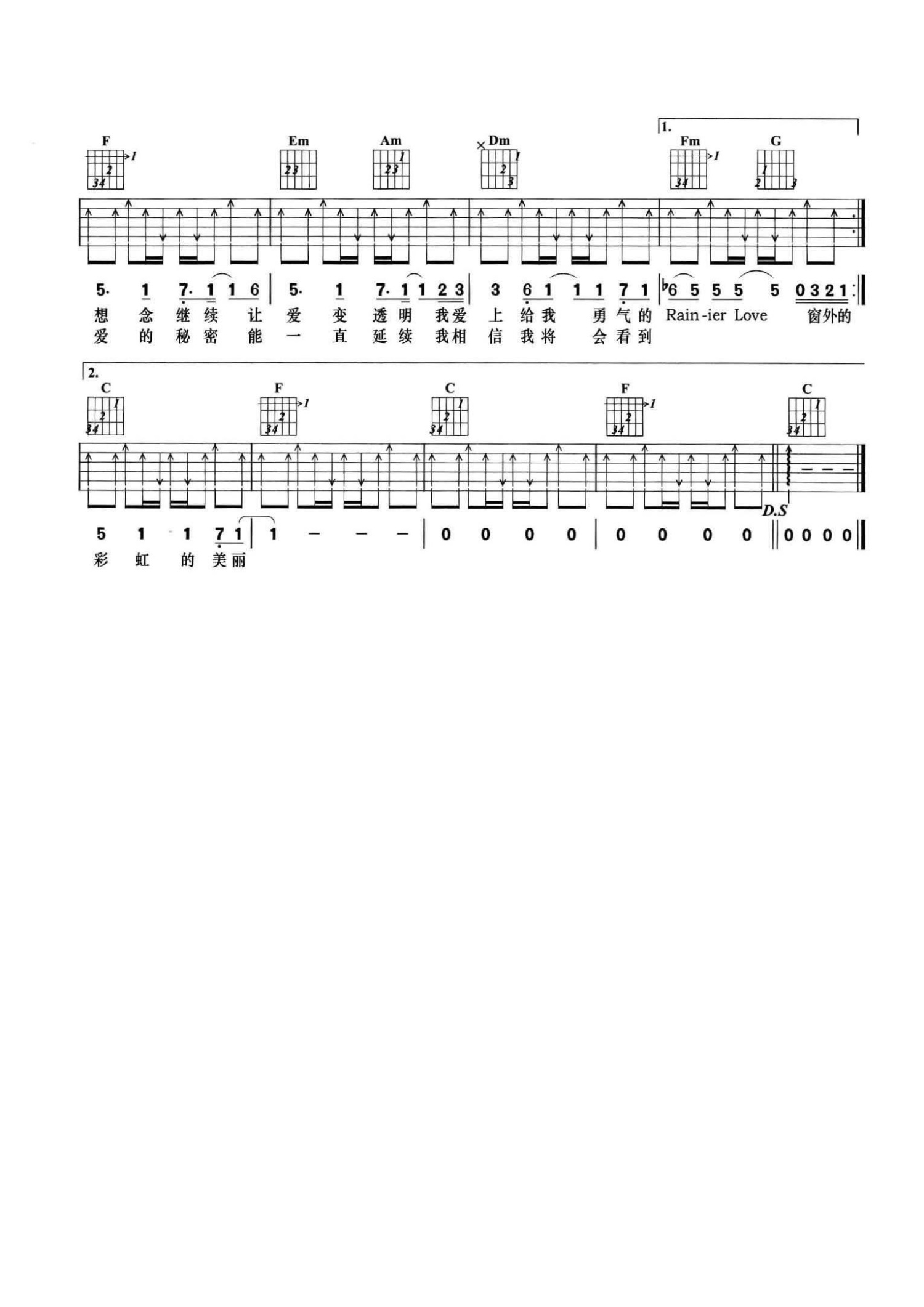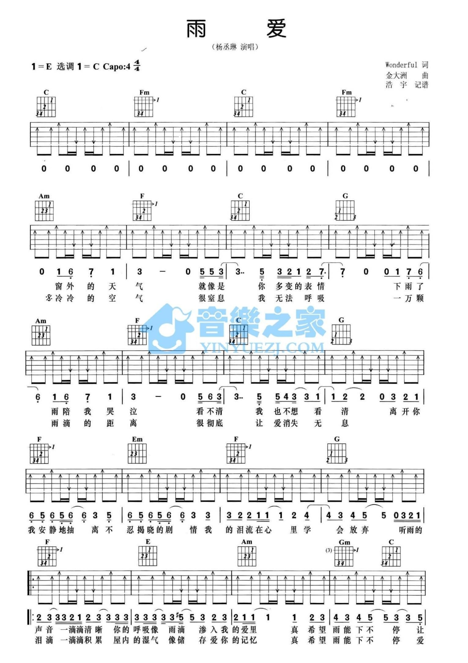 曲谱介绍: 杨丞琳《雨爱》吉他谱_C调吉他弹唱谱