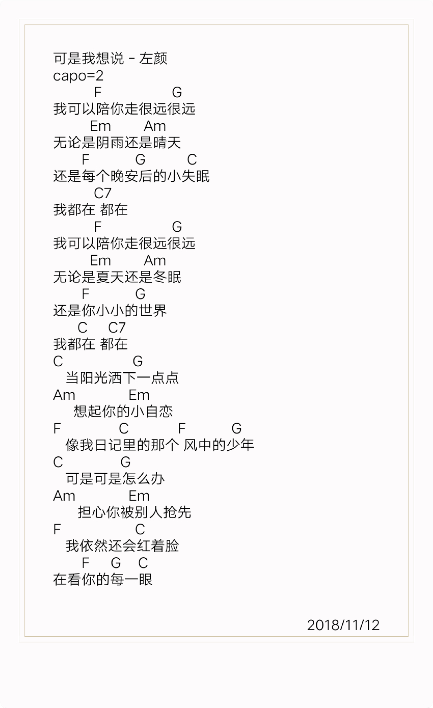 曲谱介绍: 左颜《可是我想说》吉他谱_C调吉他弹唱谱_和弦谱
