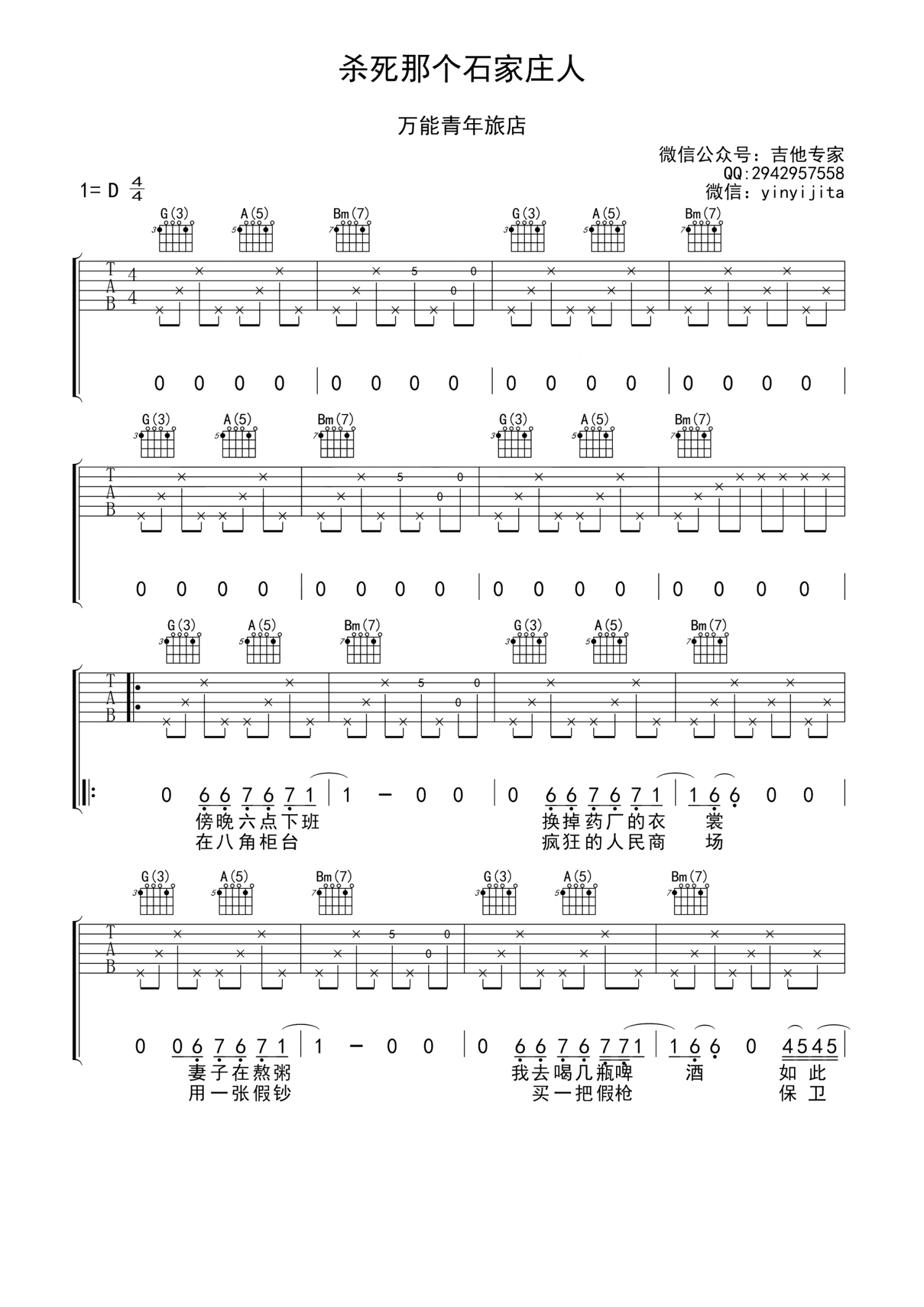 曲谱介绍: 万能青年旅店《杀死那个石家庄人》吉他谱_D调吉他弹唱谱