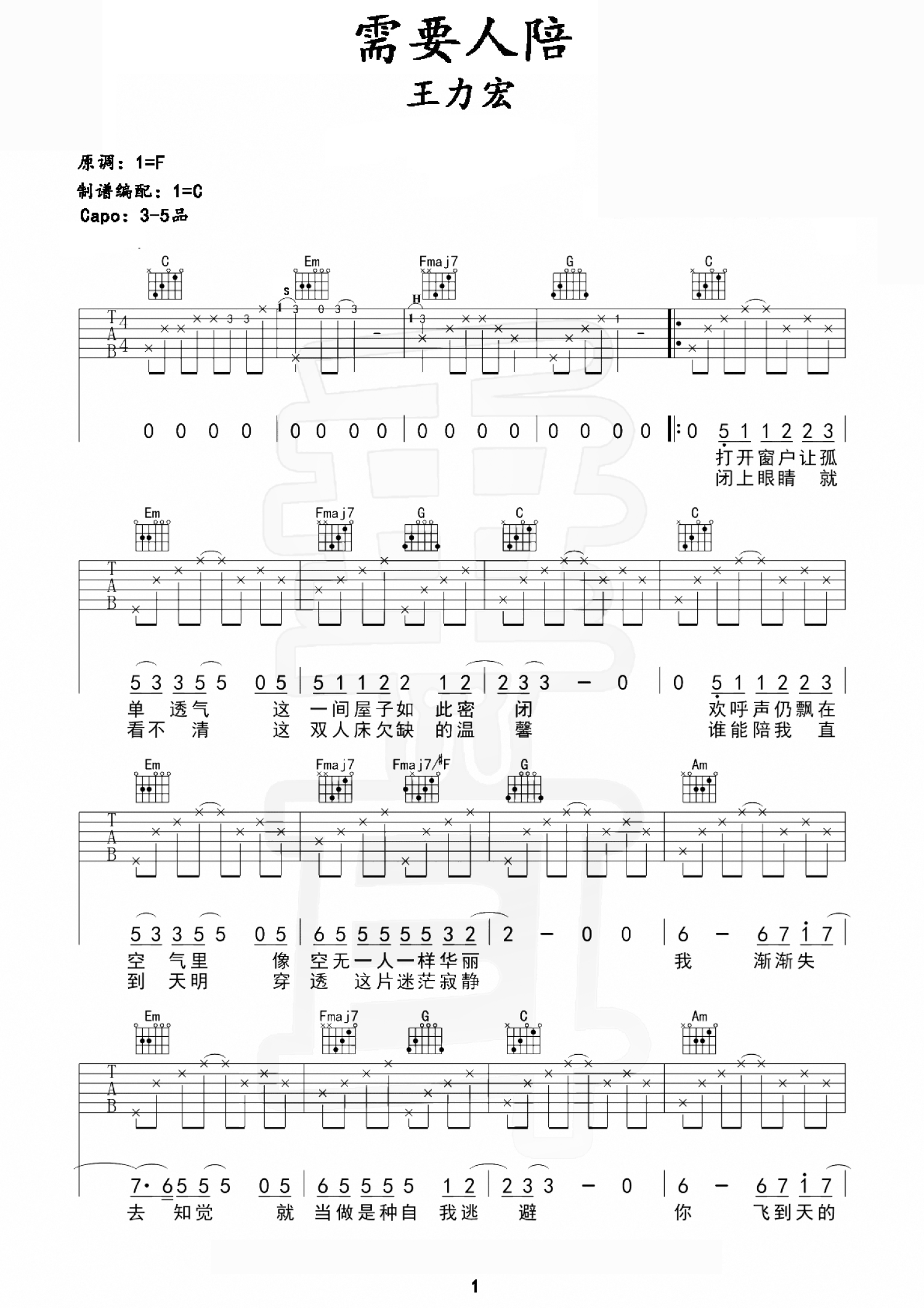 需要人陪吉他谱 - 王力宏 - C调吉他弹唱谱