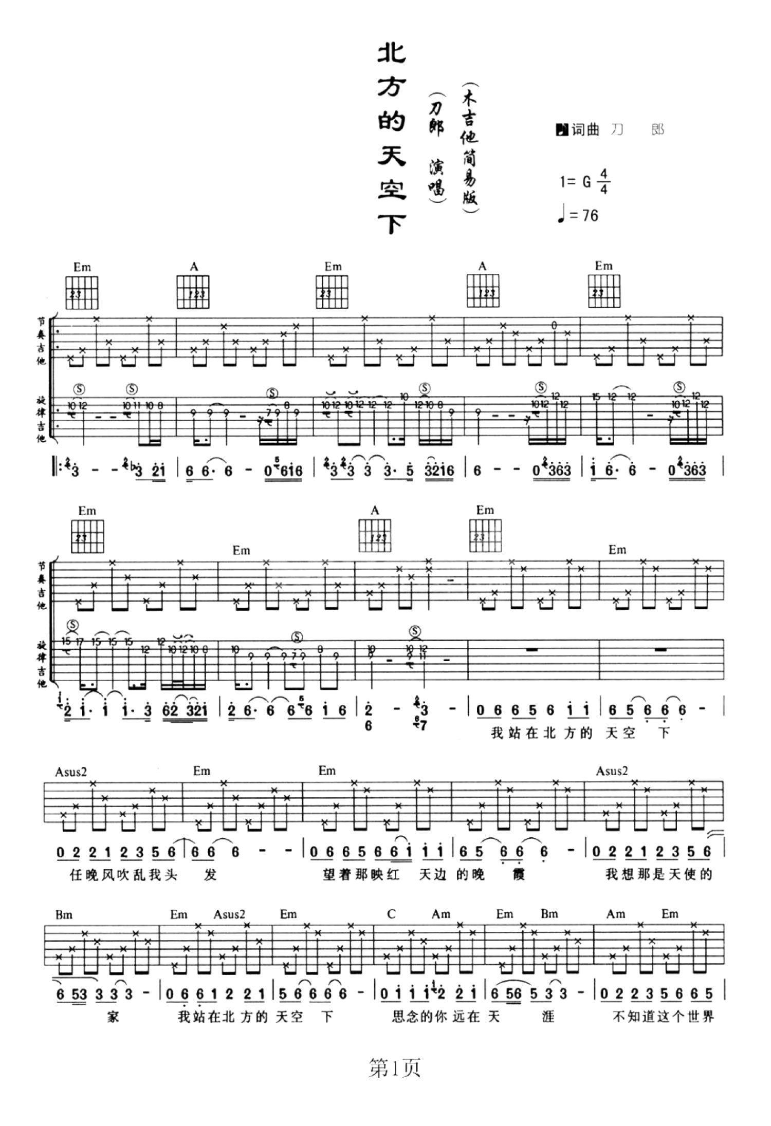 曲谱介绍: 刀郎《北方的天空下》吉他谱_G调吉他弹唱谱