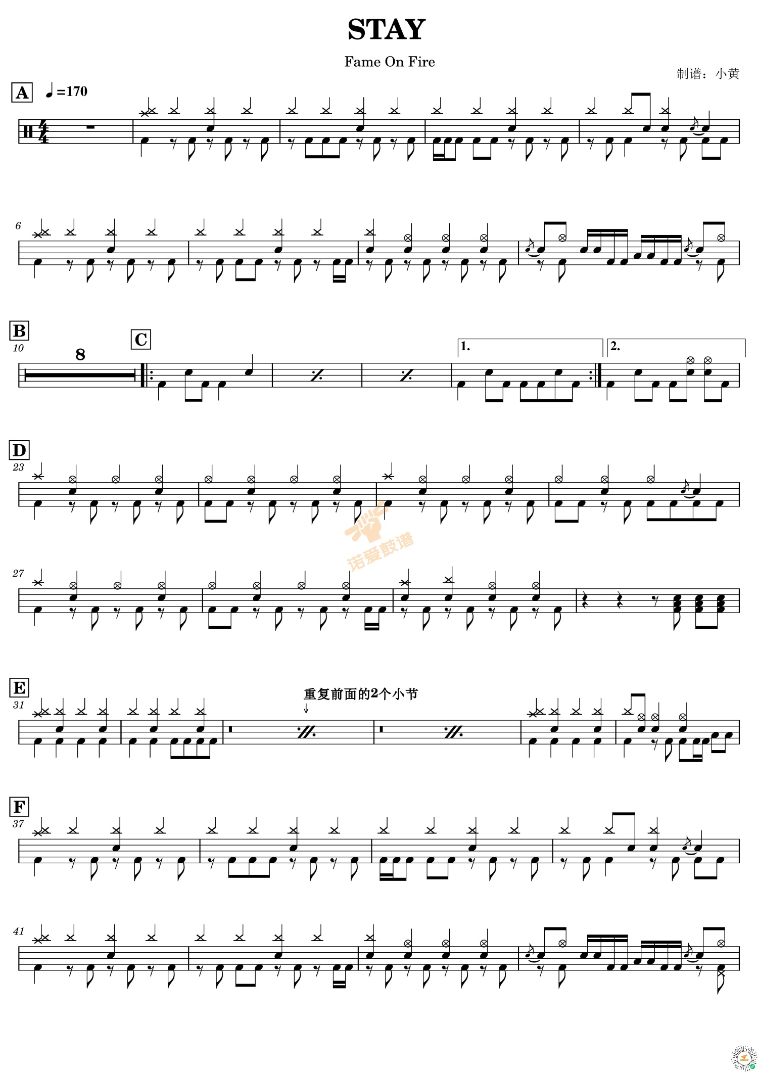 STAY鼓谱 - Fame On Fire - 架子鼓谱