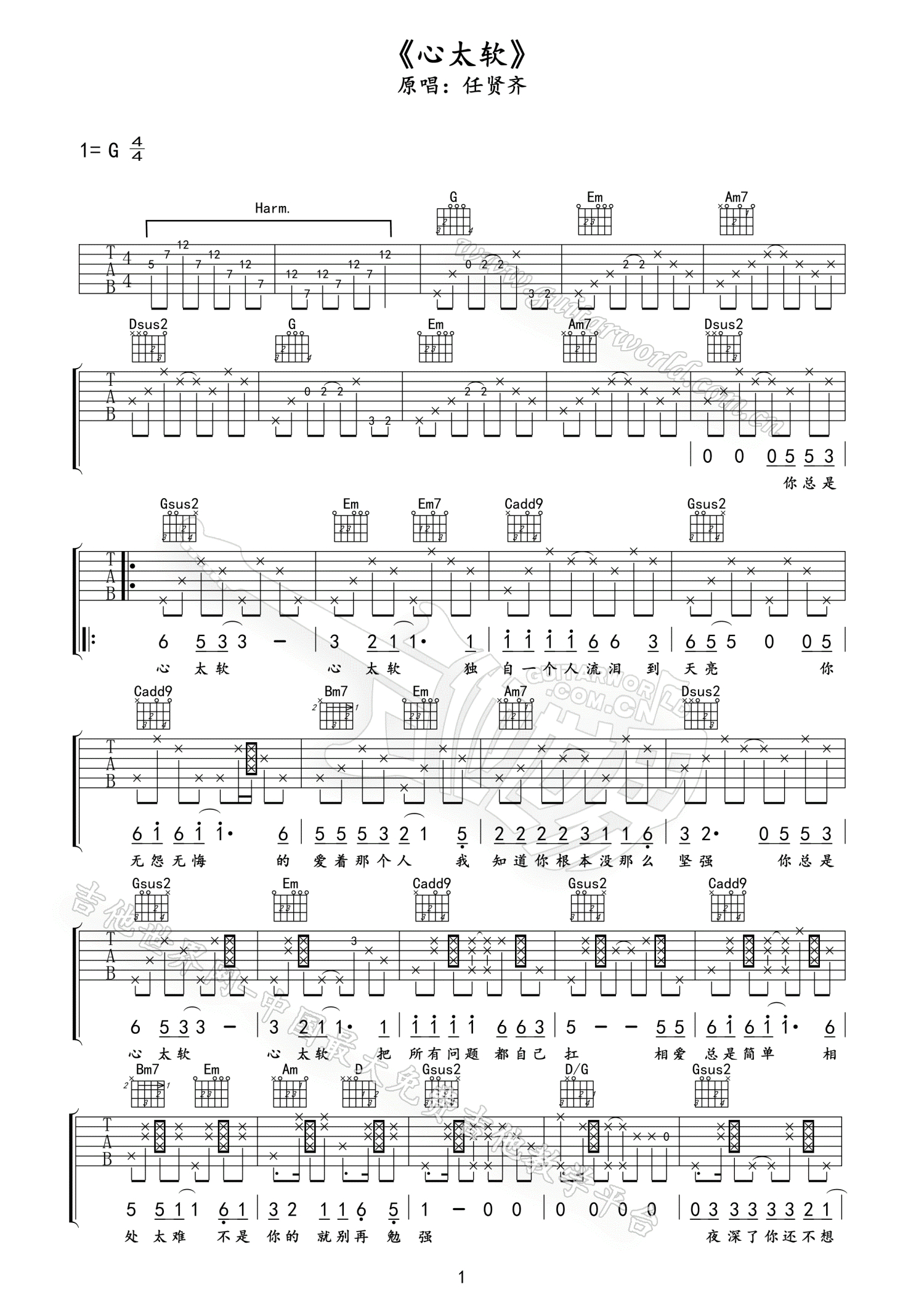 曲谱介绍: 任贤齐《心太软》吉他谱_G调吉他弹唱谱