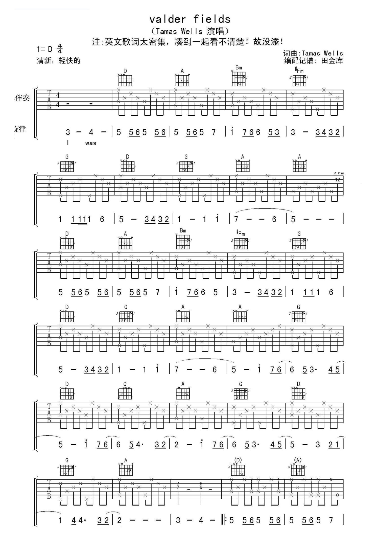 曲谱介绍: Tamas Wells《valder fields》吉他谱_D调吉他弹唱谱