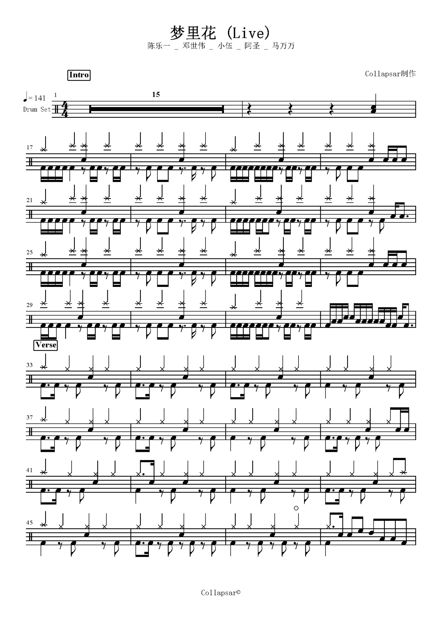 梦里花鼓谱 - 陈乐一 /邓世伟/ 小伍/ 阿圣 /马万万 - 架子鼓谱 - Live