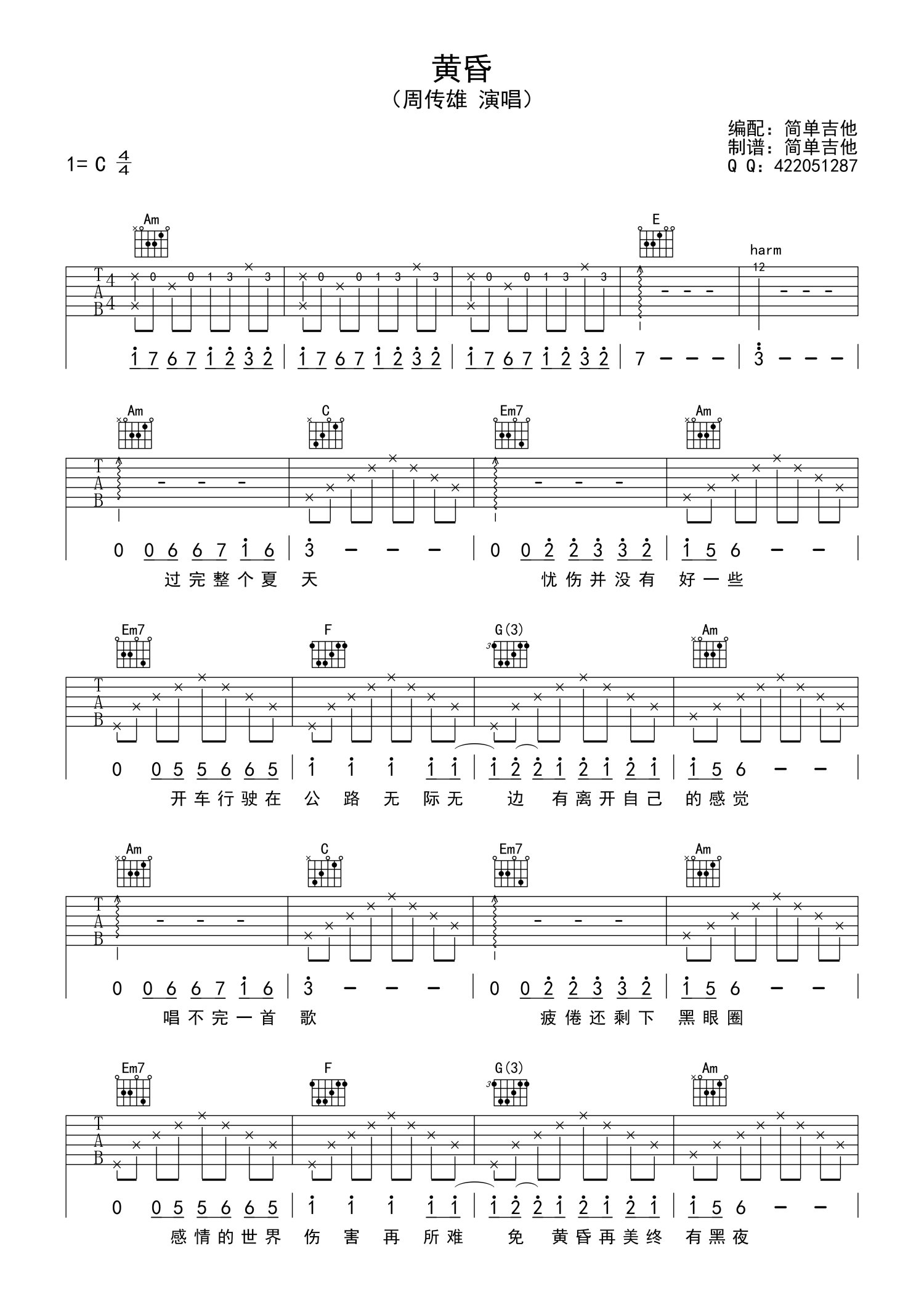 曲谱介绍: 黄昏吉他谱简单谱_周传雄_黄昏吉他谱C调完整版