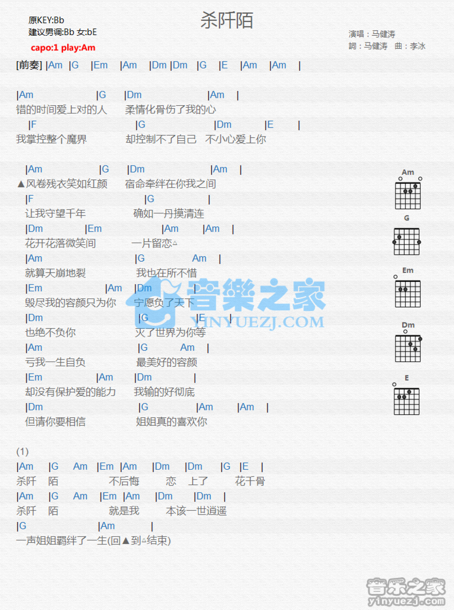 曲谱介绍: 马健涛《杀阡陌》吉他谱_A调吉他弹唱谱_和弦谱
