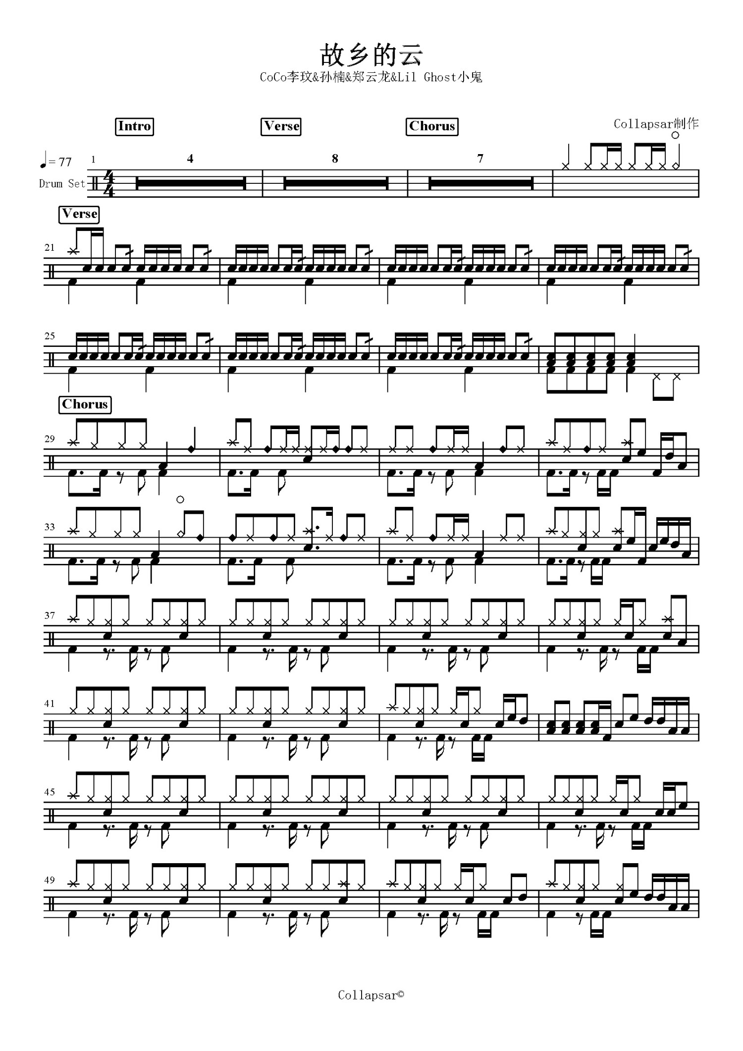 故乡的云鼓谱 - CoCo李玟/孙楠/郑云龙/Lil Ghost小鬼 - 架子鼓谱