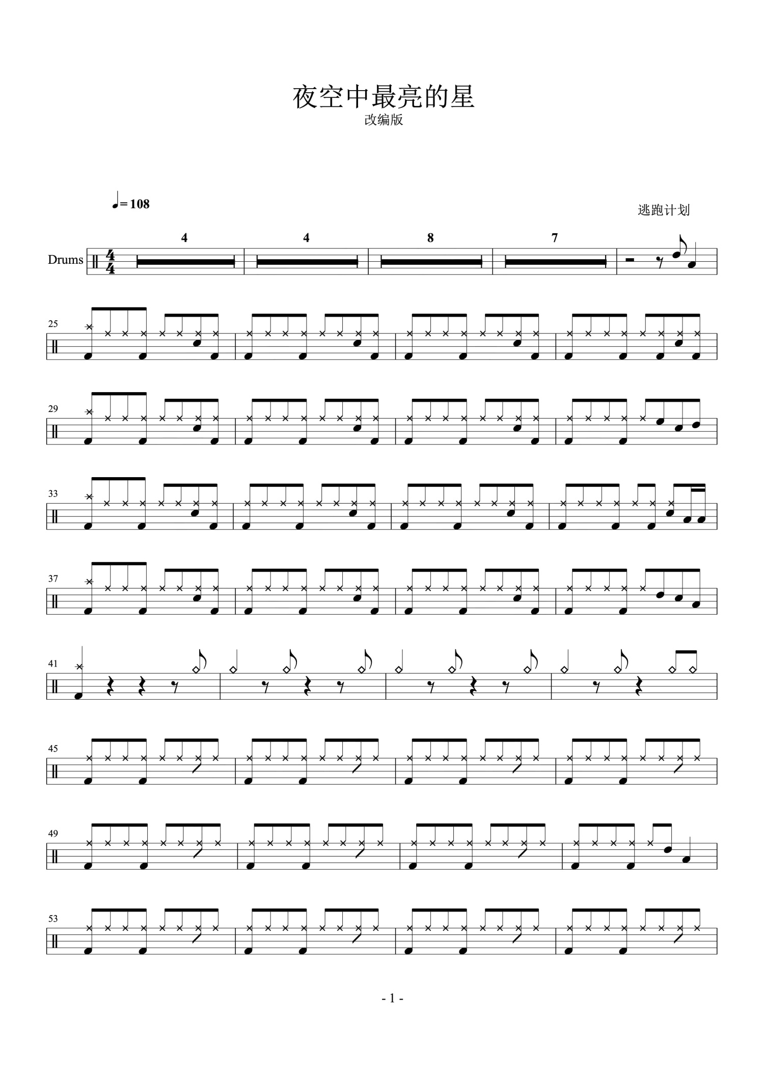 • 夜空中最亮的星鼓谱 - 逃跑计划 - 架子鼓谱第1张