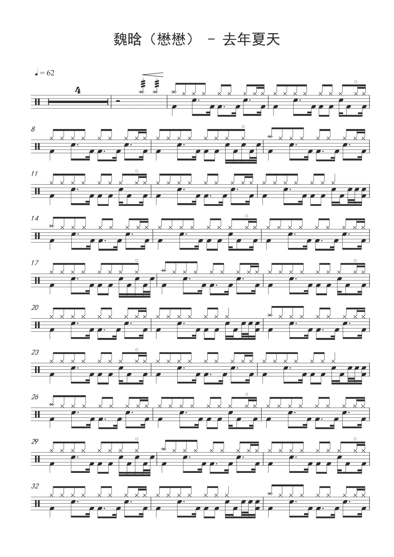 去年夏天鼓谱 - 魏晗/懋懋 - 架子鼓谱