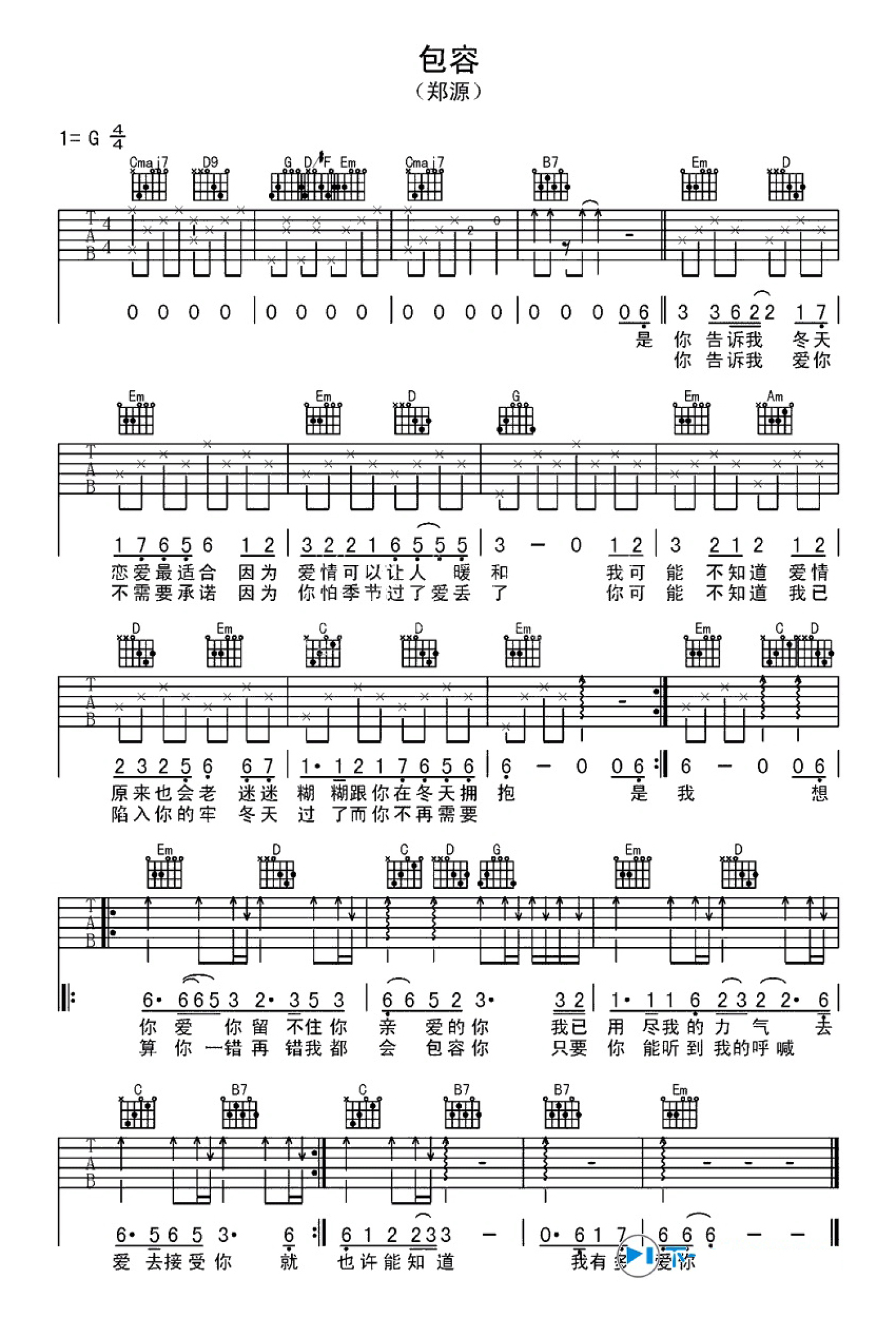 包容吉他谱 - 郑源 - G调吉他弹唱谱