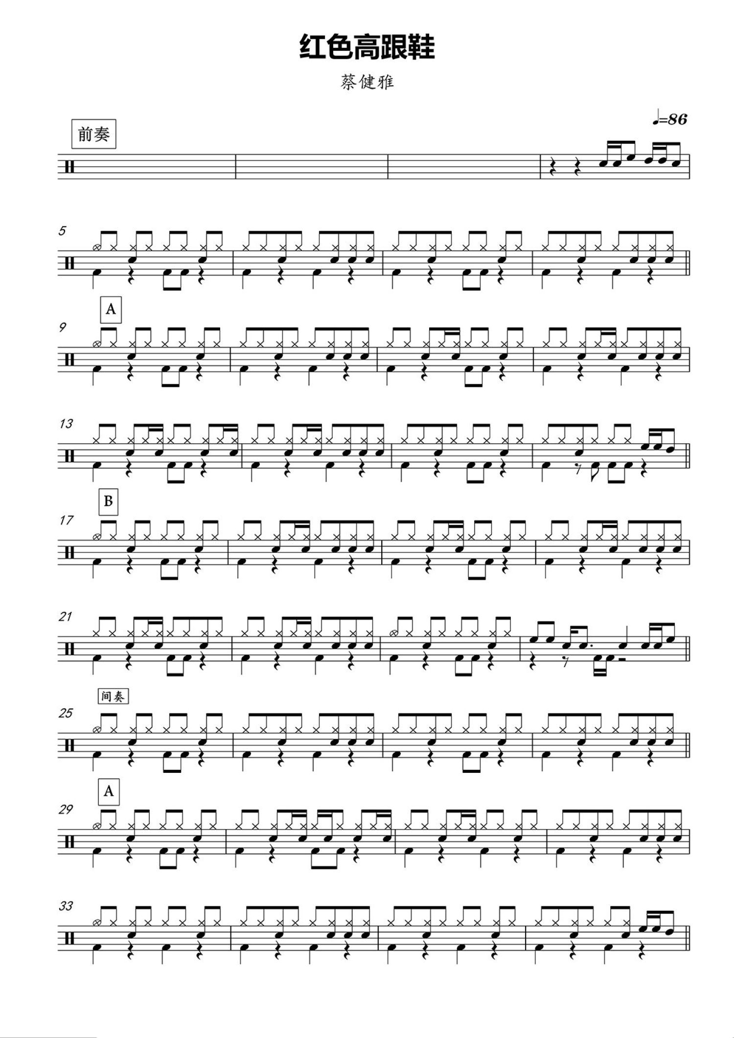 • 红色高跟鞋鼓谱 - 蔡健雅 - 架子鼓谱第1张
