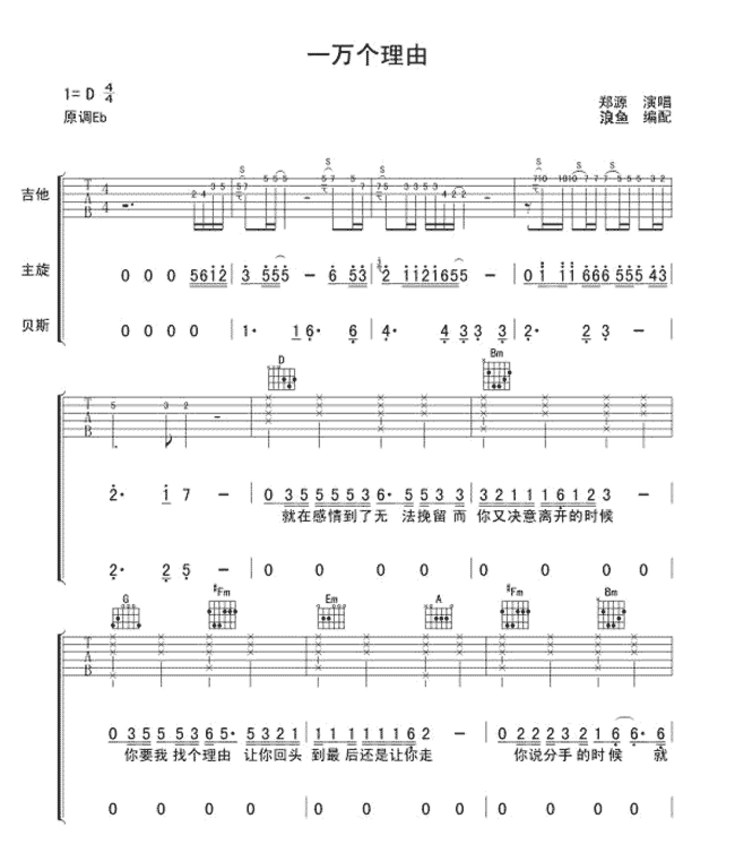 曲谱介绍: 郑源《一万个理由》吉他谱_D调吉他弹唱谱