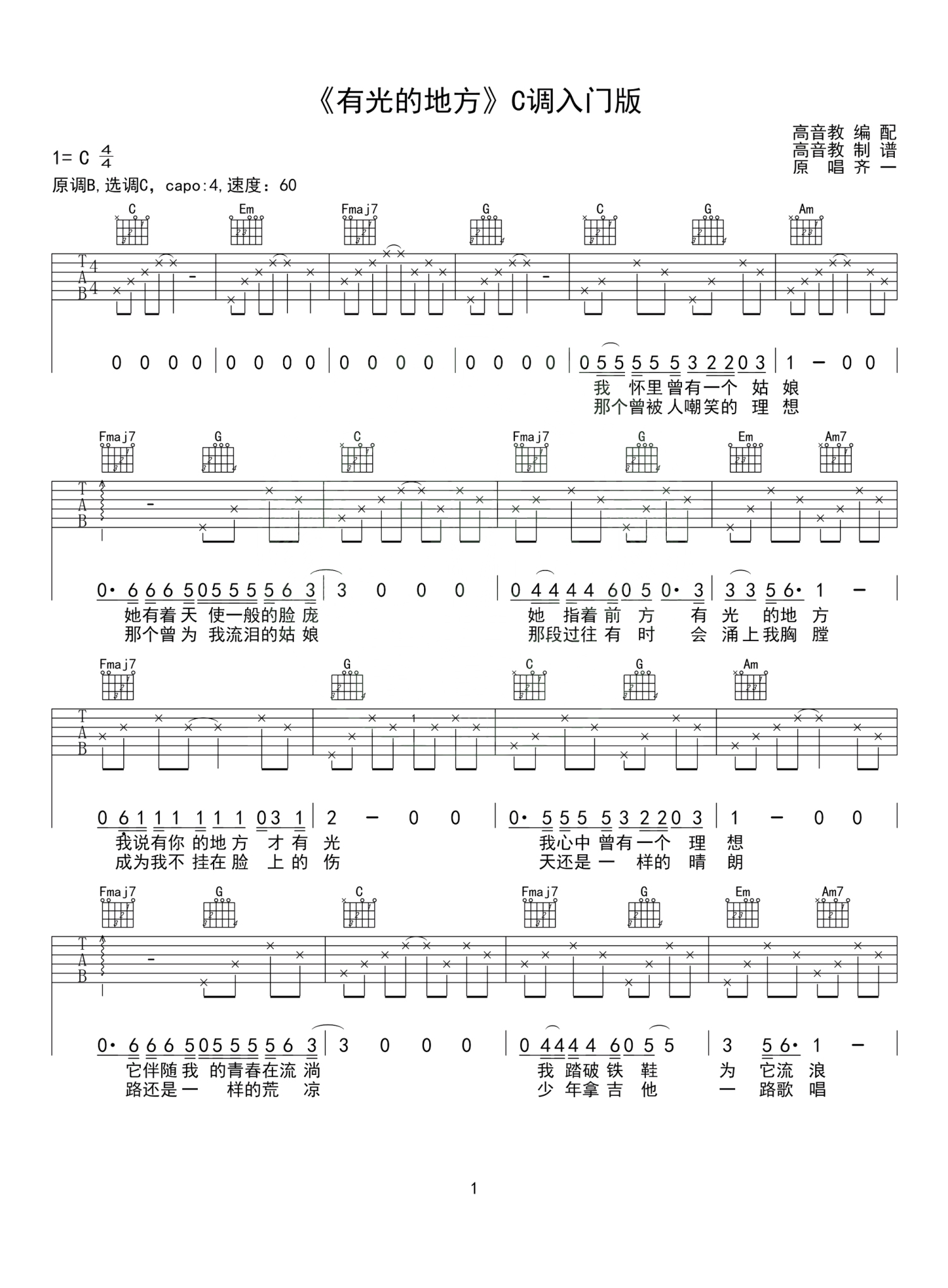 曲谱介绍: 《有光的地方》吉他谱,齐一原创的一首民谣歌曲,美好的爱情,美好的你,有你的地方才有光。原调B,选用C调,CAPO夹四品。最近总是想起年少时的爱情,那样青涩的爱情,是刻在骨子里的心动。第一次牵手,你们尴尬,紧张,脸红心跳,两个人的手心已经渗满了汗也不知该怎么松开;第一次亲吻,你们还是尴尬,紧张,脸红心跳,只是亲亲的碰一下都能在晚上睡觉的时候想起来兴奋到半夜。美好的爱情,美好的你,有你的地方才有光。那些非你不可的承诺,在各种各样的现实里变得没有了痕迹,我们最后只剩下回忆了。那个裙角飞扬的姑娘,衬衣楚楚的少年,都是我们生命里最温暖的回忆。
