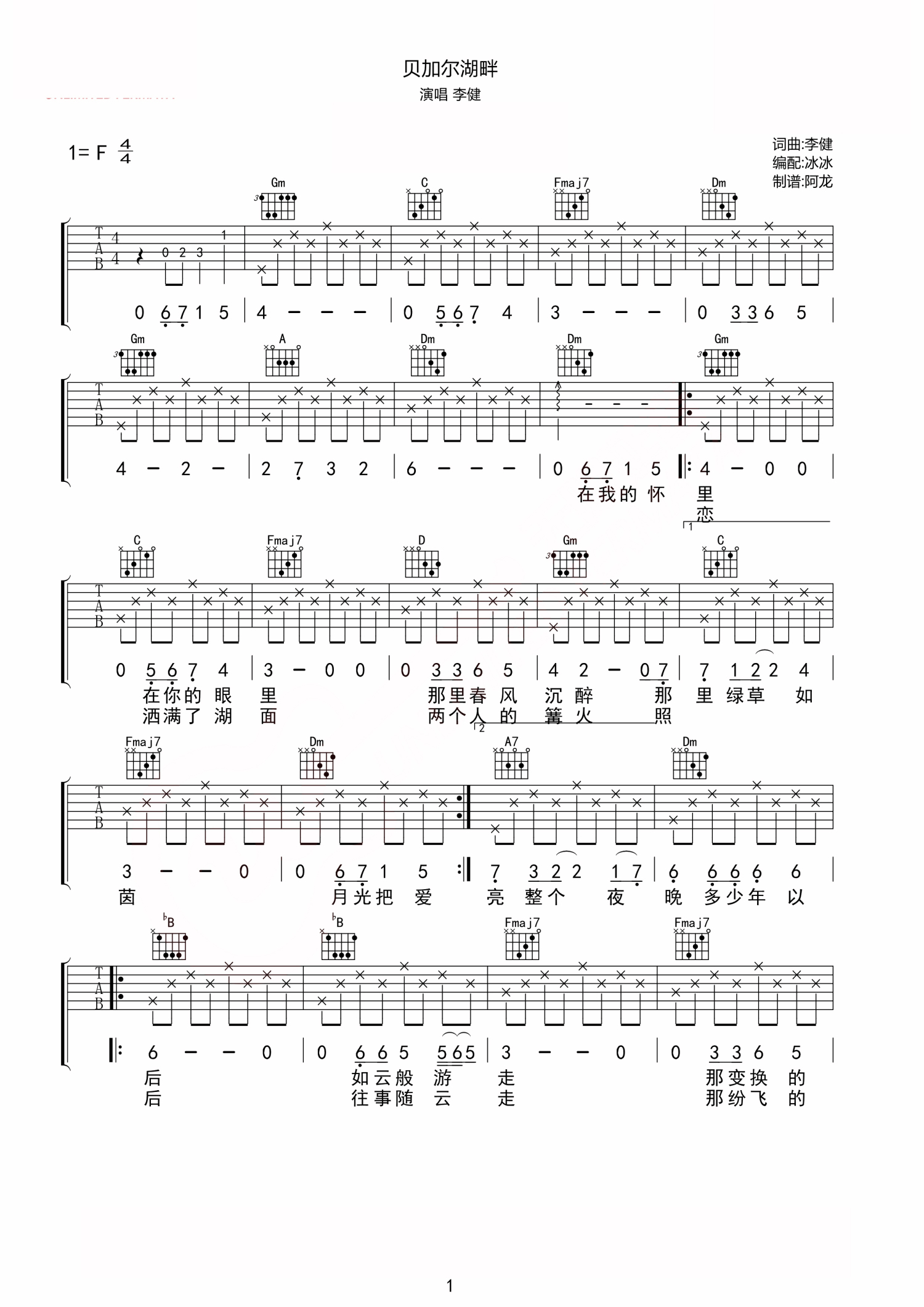 贝加尔湖畔吉他谱 - 李健 - F调吉他弹唱谱